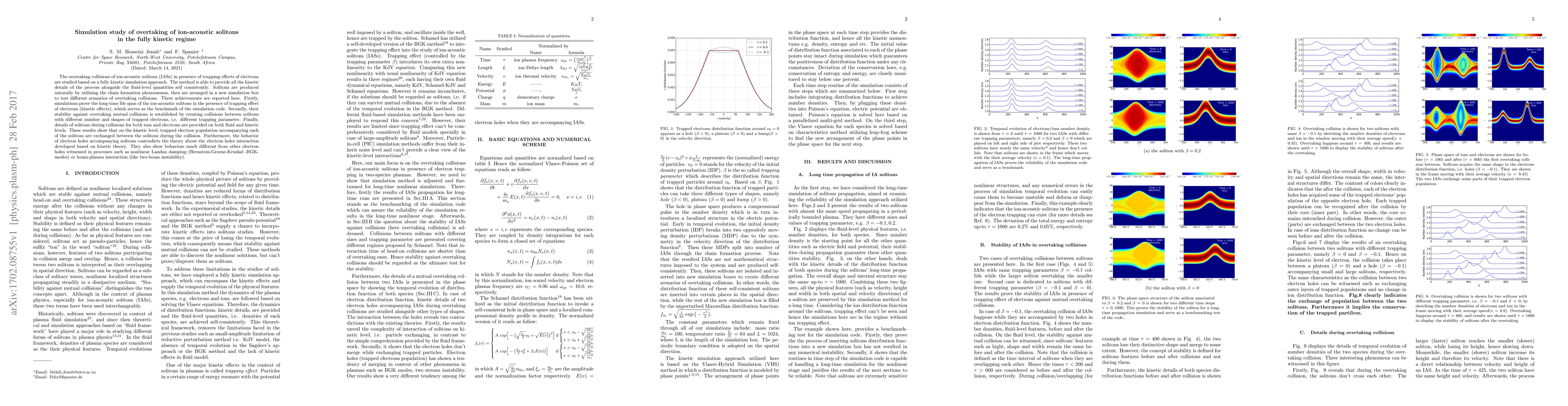 The overtaking collisions of ion-acoustic solitons (IASs) in presence of trapping effects of electrons are studied based on a fully kinetic simulation approach. The method is able to provide all the kinetic details of the process alongside the fluid-level quantities self consistently. Solitons are produced naturally by utilizing the chain formation phenomenon, then are arranged in a new simulation box to test different scenarios of overtaking collisions. Three achievements are reported here. Firstly, simulations prove the long-time life span of the ion-acoustic solitons in the presence of trapping effect of electrons (kinetic effects), which serves as the benchmark of the simulation code. Secondly, their stability against overtaking mutual collisions is established by creating collisions between solitons with different number and shapes of trapped electrons, i.e. different trapping parameter. Finally, details of solitons during collisions for both ions and electrons are provided on both fluid and kinetic levels. These results show that on the kinetic level, trapped electron population accompanying each of the solitons are exchanged between the solitons during the collision. Furthermore, the behavior of electron holes accompanying solitons contradicts the theory about the electron holes interaction developed based on kinetic theory. They also show behaviors much different from other electron holes witnessed in processes such as nonlinear Landau damping (Bernstein-Greene-Kruskal -BGK- modes) or beam-plasma interaction (like two-beam instability).