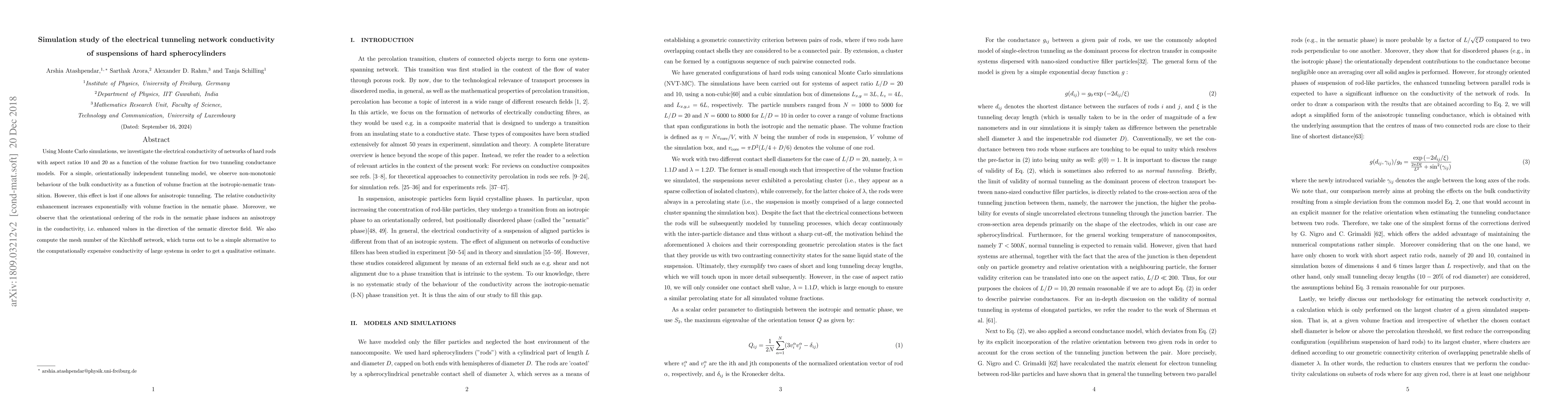 Researchers used computer simulations to study how electric conductivity changes in suspensions of hard spherocylinders as their volume fraction increases. They found that conductivity is affected differently depending on whether the tunneling between particles is isotropic or anisotropic.