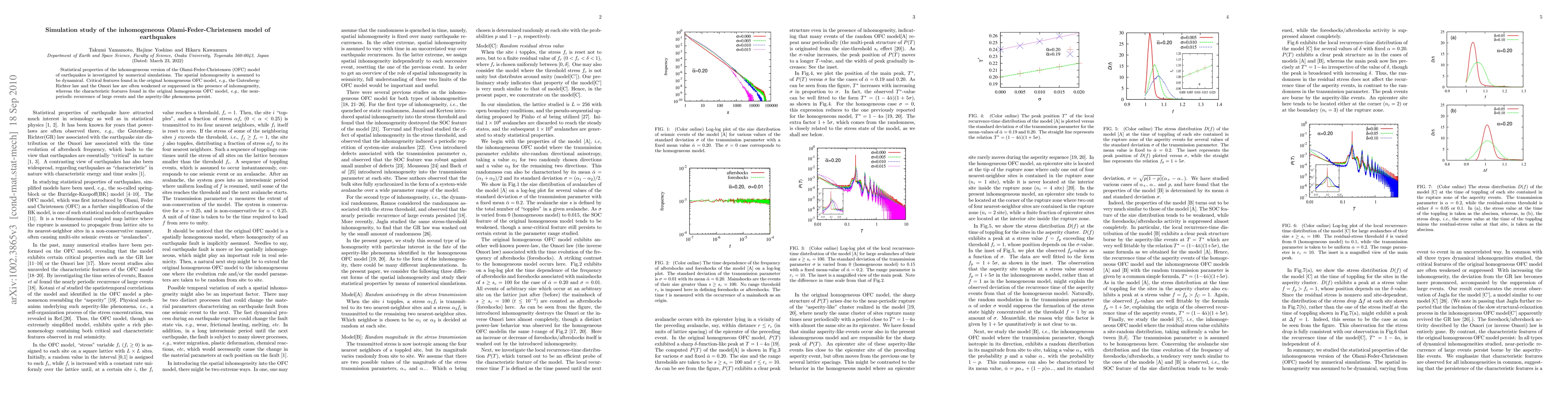 This paper investigates the statistical properties of the inhomogeneous Olami-Feder-Christensen (OFC) model of earthquakes through numerical simulations, revealing that while critical features like the Gutenberg-Richter law are weakened, the near-periodic recurrence of large events and asperity-like phenomena persist. Spatial inhomogeneity in the model is shown to suppress some original features but maintain others.