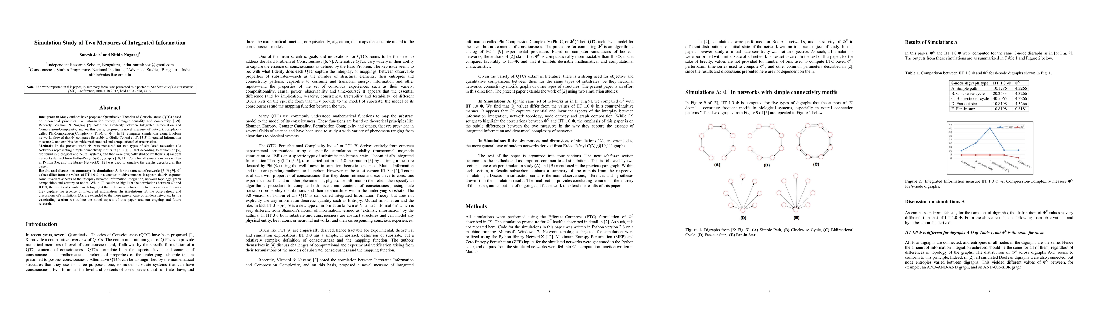 Background: Many authors have proposed Quantitative Theories of Consciousness (QTC) based on theoretical principles like information theory, Granger causality and complexity. Recently, Virmani and Nagaraj (arXiv:1608.08450v2 [cs.IT]) noted the similarity between Integrated Information and Compression-Complexity, and on this basis, proposed a novel measure of network complexity called Phi-Compression Complexity (Phi-C or $\Phi^C$). Their computer simulations using Boolean networks showed that $\Phi^C$ compares favorably to Giulio Tononi et al's Integrated Information measure $\Phi$ 3.0 and exhibits desirable mathematical and computational characteristics. Methods: In the present work, $\Phi^C$ was measured for two types of simulated networks: (A) Networks representing simple neuronal connectivity motifs (presented in Fig.9 of Tononi and Sporns, BMC Neuroscience 4(1), 2003); (B) random networks derived from Erd\"os-R \'enyi G(N, p)graphs. Code for all simulations was written in Python 3.6, and the library NetworkX was used to simulate the graphs. Results and discussions summary: In simulations A, for the same set of networks, $\Phi^C$ values differ from the values of IIT 1.0 $\Phi$ in a counter-intuitive manner. It appears that $\Phi^C$ captures some invariant aspects of the interplay between information integration, network topology, graph composition and node entropy. While Virmani and Nagaraj (arXiv:1608.08450v2 [cs.IT]) sought to highlight the correlations between $\Phi^C$ and IIT $\Phi$, the results of simulations A highlight the differences between the two measures in the way they capture the integrated information. In simulations B, the results of simulations A are extended to the more general case of random networks. In the concluding section we outline the novel aspects of this paper, and our ongoing and future research.