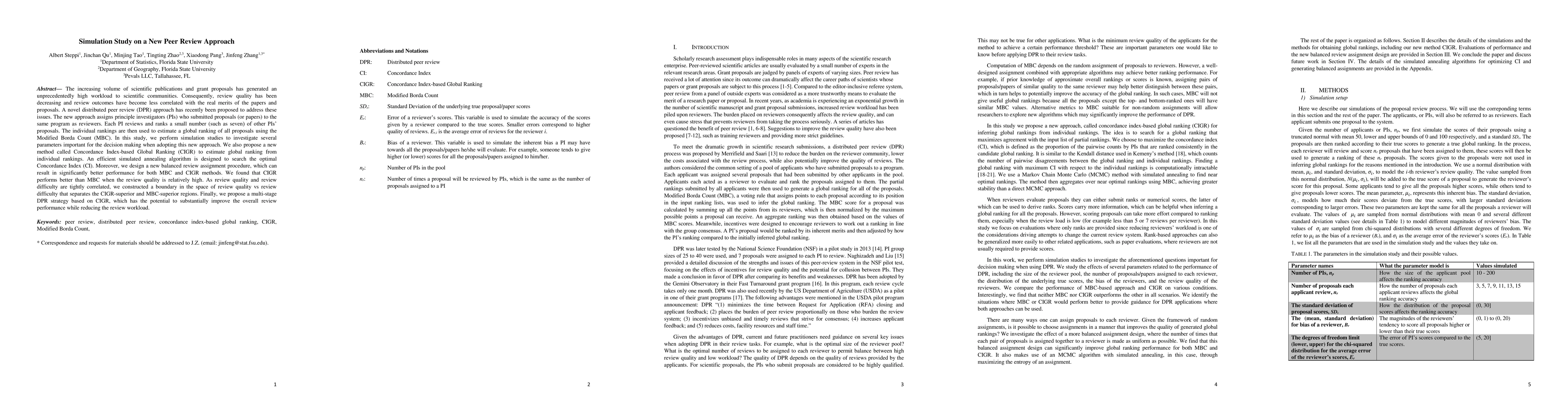 The increasing volume of scientific publications and grant proposals has generated an unprecedentedly high workload to scientific communities. Consequently, review quality has been decreasing and review outcomes have become less correlated with the real merits of the papers and proposals. A novel distributed peer review (DPR) approach has recently been proposed to address these issues. The new approach assigns principal investigators (PIs) who submitted proposals (or papers) to the same program as reviewers. Each PI reviews and ranks a small number (such as seven) of other PIs' proposals. The individual rankings are then used to estimate a global ranking of all proposals using the Modified Borda Count (MBC). In this study, we perform simulation studies to investigate several parameters important for the decision making when adopting this new approach. We also propose a new method called Concordance Index-based Global Ranking (CIGR) to estimate global ranking from individual rankings. An efficient simulated annealing algorithm is designed to search the optimal Concordance Index (CI). Moreover, we design a new balanced review assignment procedure, which can result in significantly better performance for both MBC and CIGR methods. We found that CIGR performs better than MBC when the review quality is relatively high. As review quality and review difficulty are tightly correlated, we constructed a boundary in the space of review quality vs review difficulty that separates the CIGR-superior and MBC-superior regions. Finally, we propose a multi-stage DPR strategy based on CIGR, which has the potential to substantially improve the overall review performance while reducing the review workload.