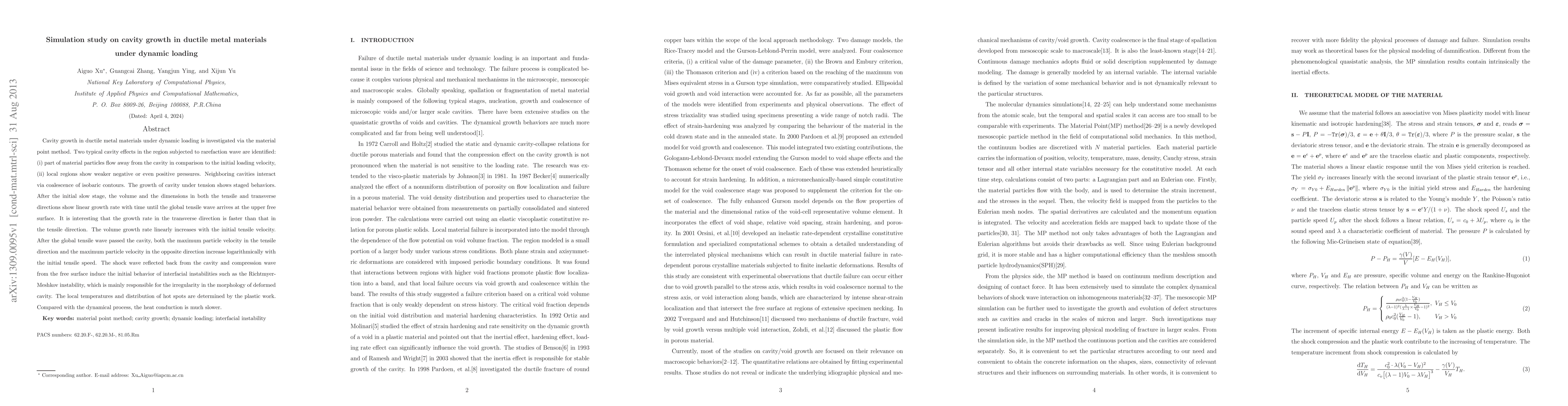 Cavity growth in ductile metal materials under dynamic loading is investigated via the material point method. Two typical cavity effects in the region subjected to rarefaction wave are identified: (i) part of material particles flow away from the cavity in comparison to the initial loading velocity, (ii) local regions show weaker negative or even positive pressures. Neighboring cavities interact via coalescence of isobaric contours. The growth of cavity under tension shows staged behaviors. After the initial slow stage, the volume and the dimensions in both the tensile and transverse directions show linear growth rate with time until the global tensile wave arrives at the upper free surface. It is interesting that the growth rate in the transverse direction is faster than that in the tensile direction. The volume growth rate linearly increases with the initial tensile velocity. After the global tensile wave passed the cavity, both the maximum particle velocity in the tensile direction and the maximum particle velocity in the opposite direction increase logarithmically with the initial tensile speed. The shock wave reflected back from the cavity and compression wave from the free surface induce the initial behavior of interfacial instabilities such as the Richtmyer-Meshkov instability, which is mainly responsible for the irregularity in the morphology of deformed cavity. The local temperatures and distribution of hot spots are determined by the plastic work. Compared with the dynamical process, the heat conduction is much slower.