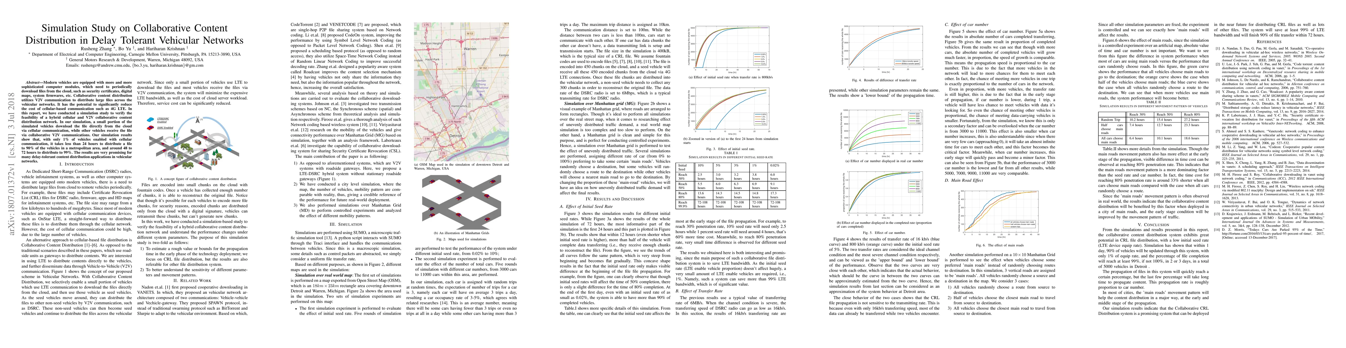 Modern vehicles are equipped with more and more sophisticated computer modules, which need to periodically download files from the cloud, such as security certificates, digital maps, system firmwares, etc. Collaborative content distribution utilizes V2V communication to distribute large files across the vehicular networks. It has the potential to significantly reduce the cost of cellular-based communication such as 4G LTE. In this report, we have conducted a simulation study to verify the feasibility of a hybrid cellular and V2V collaborative content distribution network. In our simulation, a small portion of the simulated vehicles download the file directly from the cloud via cellular communication, while other vehicles receive the file via collaborative V2V communications. Our simulation results show that, with only 1\% of vehicles enabled with cellular communication, it takes less than 24 hours to distribute a file to 90\% of the vehicles in a metropolitan area, and around 48 to 72 hours to distribute to 99\%. The results are very promising for many delay-tolerant content distribution applications in vehicular networks.