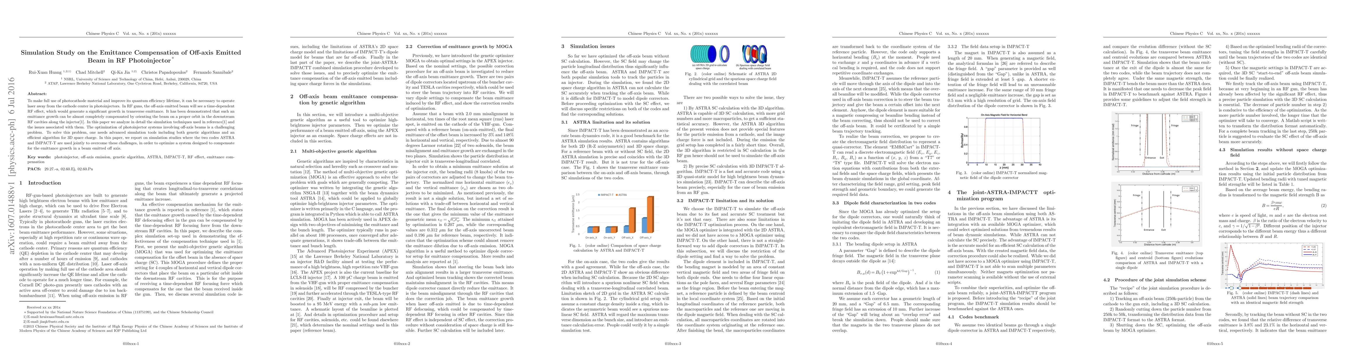 To make full use of photocathode material and improve its quantum efficiency lifetime, it can be necessary to operate laser away from the cathode center in photoinjectors. In RF guns, the off-axis emitted beam will see a time-dependent RF effect, which would generate a significant growth in transverse emittance. It has been demonstrated that such an emittance growth can be almost completely compensated by orienting the beam on a proper orbit in the downstream RF cavities along the injector. In this paper we analyze in detail the simulation techniques used in reference[1] and the issues associated with them. The optimization of photoinjector systems involving off-axis beams is a challenging problem. To solve this problem, one needs advanced simulation tools including both genetic algorithms and an efficient algorithm for 3D space charge. In this paper, we report on simulation studies where the two codes ASTRA and IMPACT-T are used jointly to overcome these challenges, in order to optimize a system designed to compensate for the emittance growth in a beam emitted off axis.