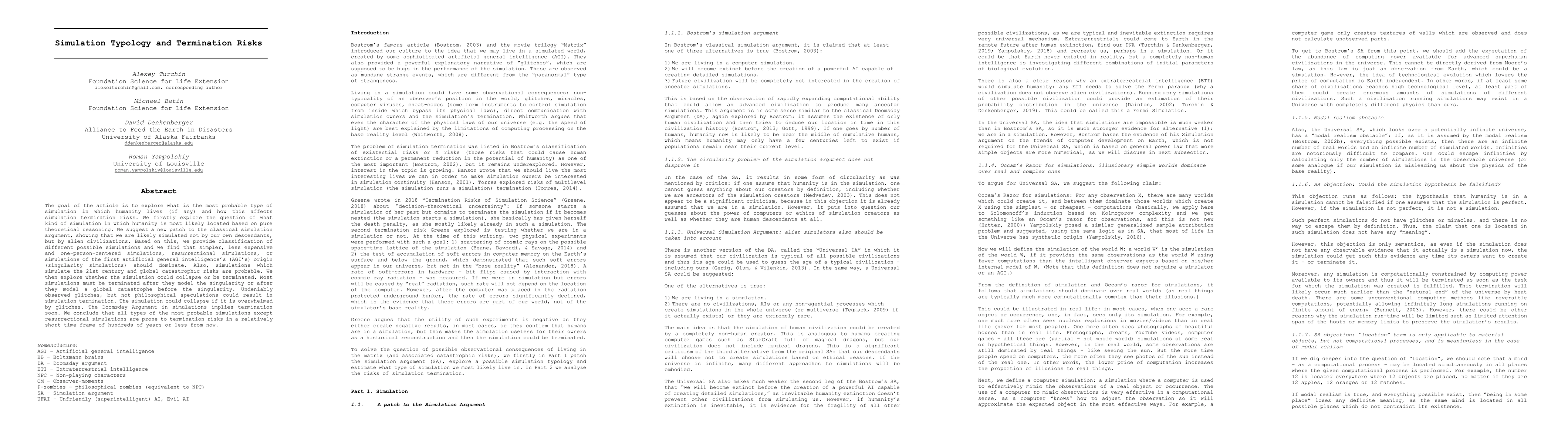 Research suggests that humanity is likely simulated by alien civilizations, with simpler simulations being the most probable type, and that these simulations are prone to termination risks within hundreds of years.
