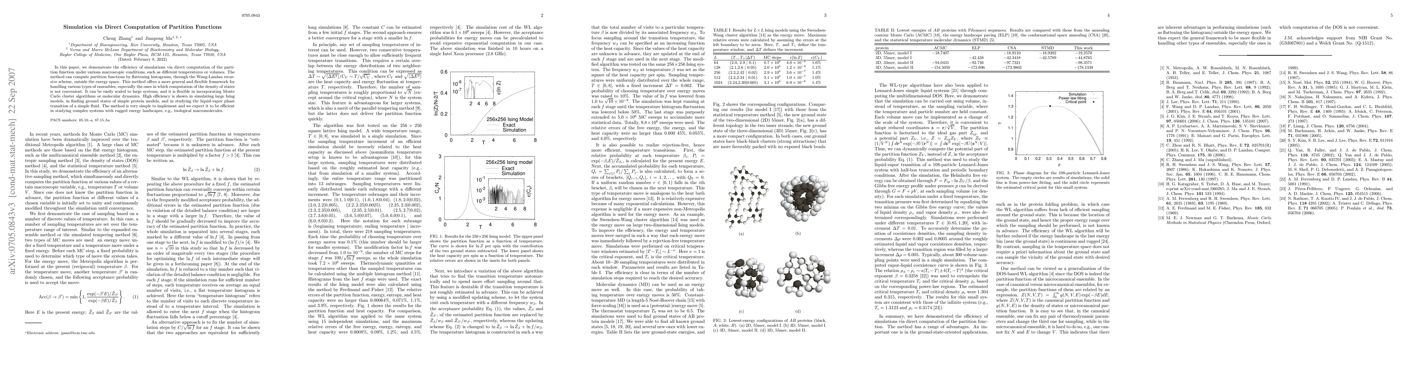 This paper presents an efficient simulation method for computing partition functions via direct computation, using the Wang-Landau algorithm. It demonstrates flexibility in handling various ensembles and scalability for large systems, showing high efficiency in simulating Ising models, protein models, and liquid-vapor phase transitions.