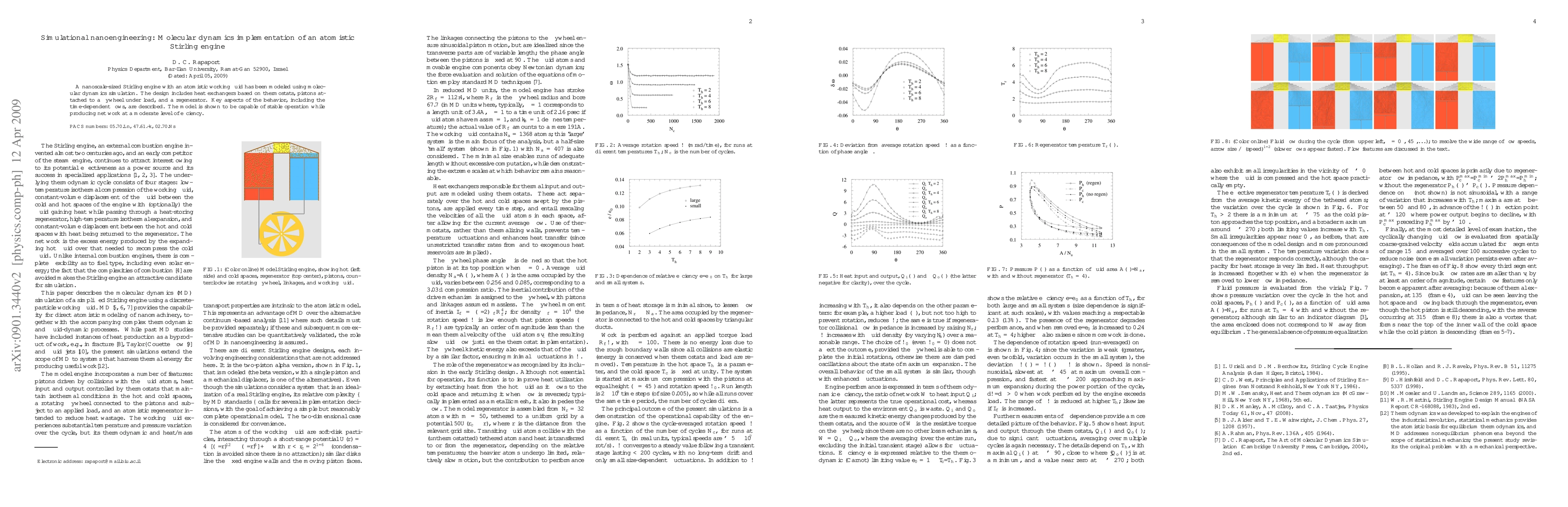This paper presents a molecular dynamics simulation of a nanoscale Stirling engine using an atomistic working fluid, featuring heat exchangers, pistons, and a regenerator, and demonstrates its stable operation and moderate efficiency in producing net work.
