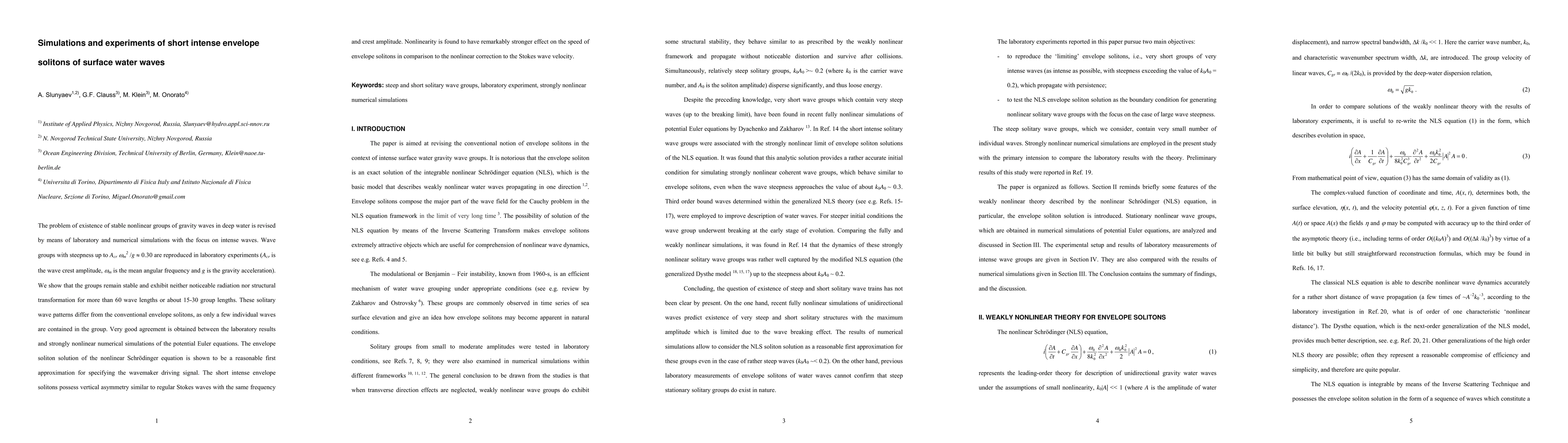 This paper investigates the stability and characteristics of short intense envelope solitons in surface water waves through laboratory experiments and numerical simulations. The study finds that these wave groups remain stable over long distances without significant transformation, and the nonlinear Schrödinger equation provides a good first approximation for their wavemaker driving signal.