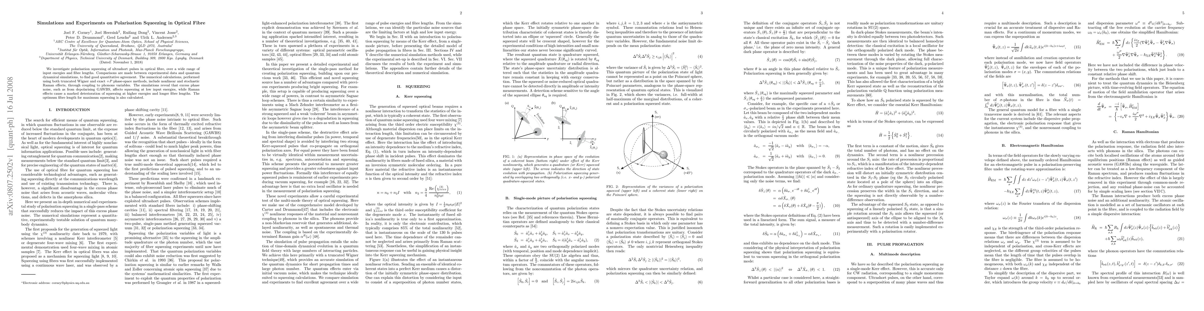 This paper investigates polarisation squeezing in optical fibres using both experimental data and quantum dynamical simulations, finding good agreement. The study reveals that phase noise impacts squeezing at low energies, while Raman effects significantly reduce squeezing at higher energies and longer fibre lengths, with an optimal fibre length for maximum squeezing identified.