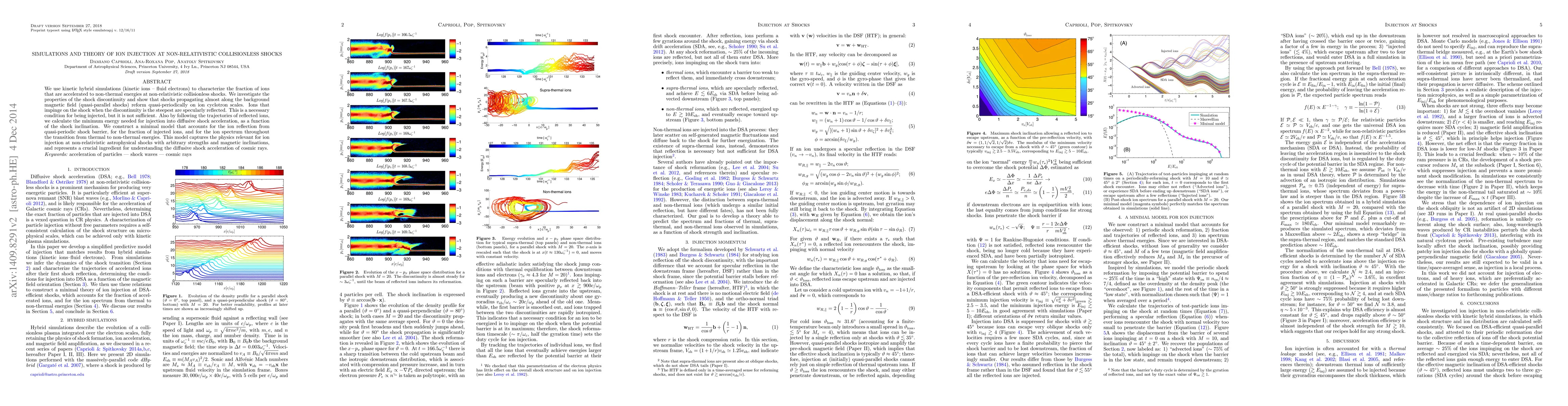 We use kinetic hybrid simulations (kinetic ions - fluid electrons) to characterize the fraction of ions that are accelerated to non-thermal energies at non-relativistic collisionless shocks. We investigate the properties of the shock discontinuity and show that shocks propagating almost along the background magnetic field (quasi-parallel shocks) reform quasi-periodically on ion cyclotron scales. Ions that impinge on the shock when the discontinuity is the steepest are specularly reflected. This is a necessary condition for being injected, but it is not sufficient. Also by following the trajectories of reflected ions, we calculate the minimum energy needed for injection into diffusive shock acceleration, as a function of the shock inclination. We construct a minimal model that accounts for the ion reflection from quasi-periodic shock barrier, for the fraction of injected ions, and for the ion spectrum throughout the transition from thermal to non-thermal energies. This model captures the physics relevant for ion injection at non-relativistic astrophysical shocks with arbitrary strengths and magnetic inclinations, and represents a crucial ingredient for understanding the diffusive shock acceleration of cosmic rays.