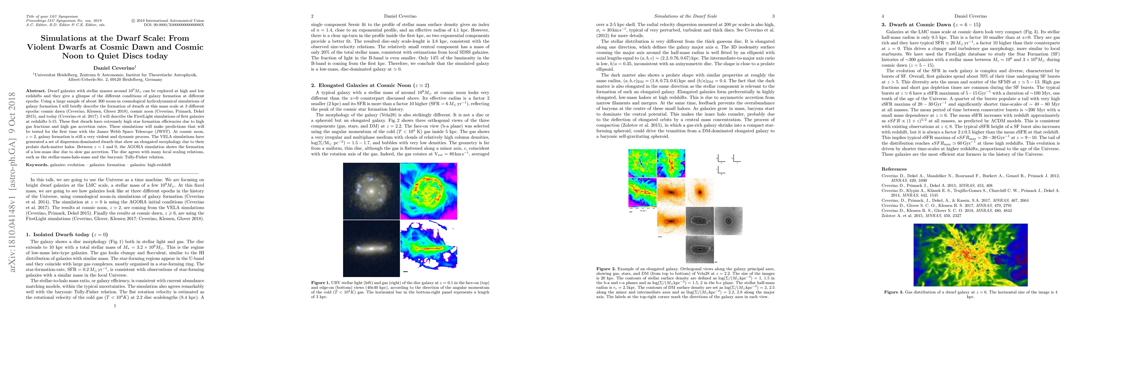 Dwarf galaxies with stellar masses around 10^9 Msun can be explored at high and low redshifts and they give a glimpse of the different conditions of galaxy formation at different epochs. Using a large sample of about 300 zoom-in cosmological hydrodynamical simulations of galaxy formation I will briefly describe the formation of dwarfs at this mass scale at 3 different epochs: cosmic dawn (Ceverino, Klessen, Glover 2018), cosmic noon (Ceverino, Primack, Dekel 2015), and today (Ceverino et al. 2017). I will describe the FirstLight simulations of first galaxies at redshifts 5-15. These first dwarfs have extremely high star formation efficiencies due to high gas fractions and high gas accretion rates. These simulations will make predictions that will be tested for the first time with the James Webb Space Telescope (JWST). At cosmic noon, z = 2, galaxy formation is still a very violent and dynamic process. The VELA simulations have generated a set of dispersion-dominated dwarfs that show an elongated morphology due to their prolate dark-matter halos. Between z = 1 and 0, the AGORA simulation shows the formation of a low-mass disc due to slow gas accretion. The disc agrees with many local scaling relations, such as the stellar-mass-halo-mass and the baryonic Tully-Fisher relation.