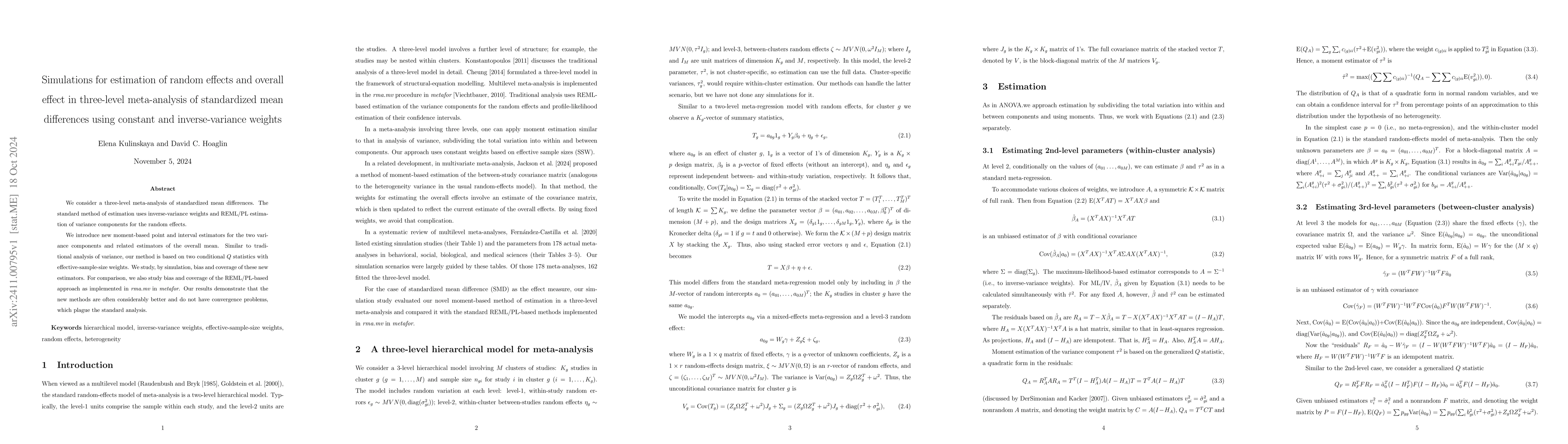 We consider a three-level meta-analysis of standardized mean differences. The standard method of estimation uses inverse-variance weights and REML/PL estimation of variance components for the random effects. We introduce new moment-based point and interval estimators for the two variance components and related estimators of the overall mean. Similar to traditional analysis of variance, our method is based on two conditional $Q$ statistics with effective-sample-size weights. We study, by simulation, bias and coverage of these new estimators. For comparison, we also study bias and coverage of the REML/PL-based approach as implemented in {\it rma.mv} in {\it metafor}. Our results demonstrate that the new methods are often considerably better and do not have convergence problems, which plague the standard analysis.
