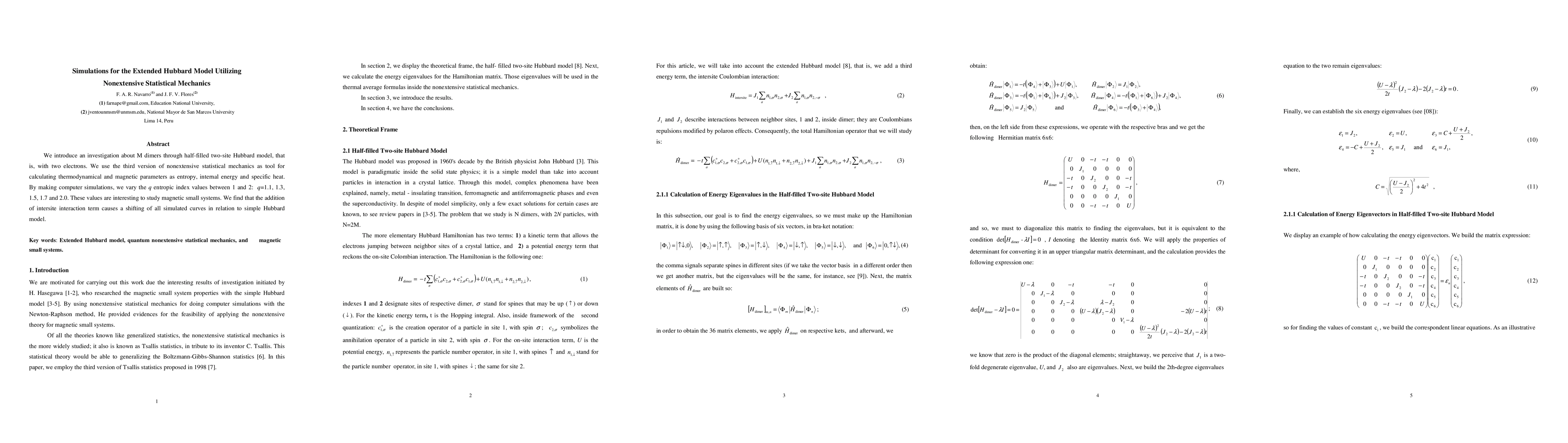 We introduce an investigation about M dimers through half-filled two-site Hubbard model, that is, with two electrons. We utilize the third version of nonextensive statistical mechanics as tool for cal-culating thermodynamical and magnetic parameters as entropy, internal energy and specific heat. By making computer simulations, we vary the q entropic index values between 1 and 2: q=1.1, 1.3, 1.5, 1.7 and 2.0. These values are interesting to study magnetic small systems. We find that the addition of intersite interaction term causes a shifting of all simulated curves in relation to simple Hubbard model.