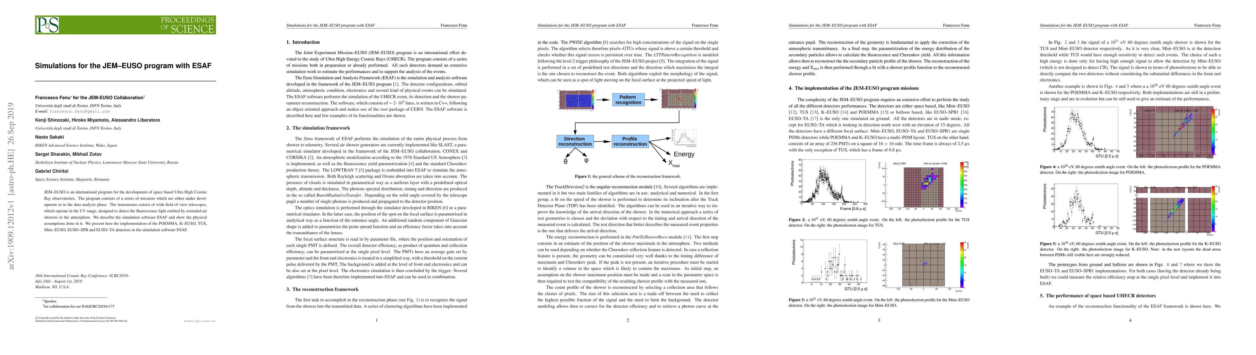 This paper details the simulation software ESAF used for the JEM-EUSO program, which aims to develop space-based observatories for ultra-high cosmic ray detection. It presents the implementation of various detectors within ESAF, including POEMMA, K-EUSO, TUS, Mini-EUSO, EUSO-SPB, and EUSO-TA.
