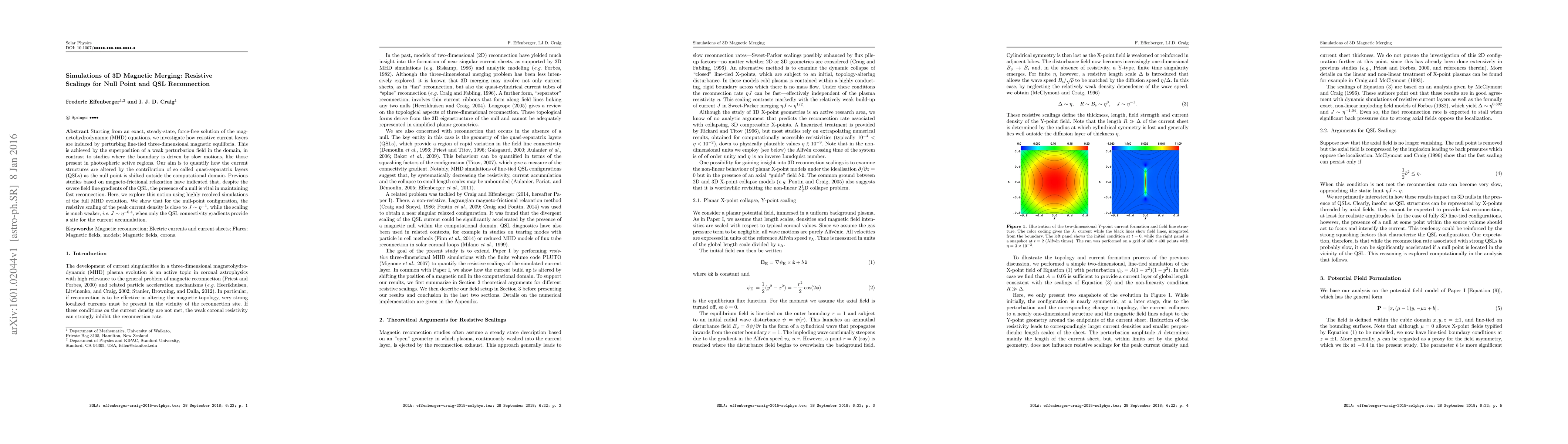 Starting from an exact, steady-state, force-free solution of the magnetohydrodynamic (MHD) equations, we investigate how resistive current layers are induced by perturbing line-tied three-dimensional magnetic equilibria. This is achieved by the superposition of a weak perturbation field in the domain, in contrast to studies where the boundary is driven by slow motions, like those present in photospheric active regions. Our aim is to quantify how the current structures are altered by the contribution of so called quasi-separatrix layers (QSLs) as the null point is shifted outside the computational domain. Previous studies based on magneto-frictional relaxation have indicated that, despite the severe field line gradients of the QSL, the presence of a null is vital in maintaining fast reconnection. Here, we explore this notion using highly resolved simulations of the full MHD evolution. We show that for the null-point configuration, the resistive scaling of the peak current density is close to $J\sim\eta^{-1}$, while the scaling is much weaker, i.e. $J\sim\eta^{-0.4}$, when only the QSL connectivity gradients provide a site for the current accumulation.