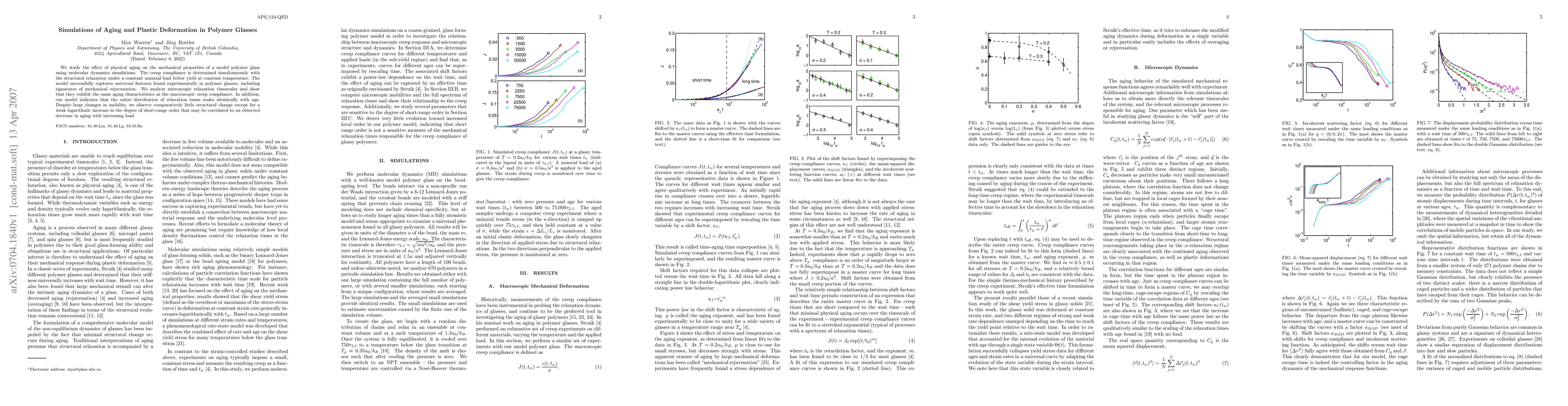 We study the effect of physical aging on the mechanical properties of a model polymer glass using molecular dynamics simulations. The creep compliance is determined simultaneously with the structural relaxation under a constant uniaxial load below yield at constant temperature. The model successfully captures universal features found experimentally in polymer glasses, including signatures of mechanical rejuvenation. We analyze microscopic relaxation timescales and show that they exhibit the same aging characteristics as the macroscopic creep compliance. In addition, our model indicates that the entire distribution of relaxation times scales identically with age. Despite large changes in mobility, we observe comparatively little structural change except for a weak logarithmic increase in the degree of short-range order that may be correlated to an observed decrease in aging with increasing load.