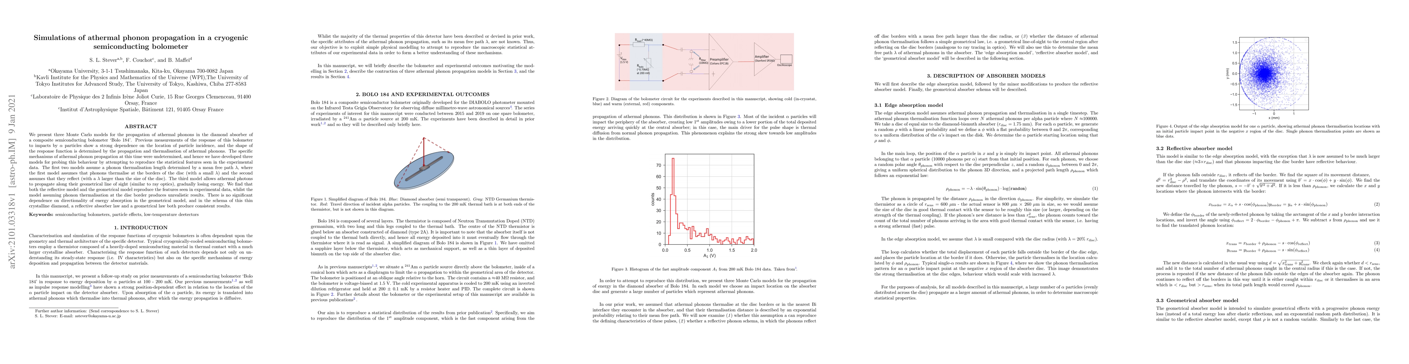 We present three Monte Carlo models for the propagation of athermal phonons in the diamond absorber of a composite semiconducting bolometer `Bolo 184'. Previous measurements of the response of this bolometer to impacts by $\alpha$ particles show a strong dependence on the location of particle incidence, and the shape of the response function is determined by the propagation and thermalisation of athermal phonons. The specific mechanisms of athermal phonon propagation at this time were undetermined, and hence we have developed three models for probing this behaviour by attempting to reproduce the statistical features seen in the experimental data. The first two models assume a phonon thermalisation length determined by a mean free path $\lambda$, where the first model assumes that phonons thermalise at the borders of the disc (with a small $\lambda$) and the second assumes that they reflect (with a $\lambda$ larger than the size of the disc). The third model allows athermal photons to propagate along their geometrical line of sight (similar to ray optics), gradually losing energy. We find that both the reflective model and the geometrical model reproduce the features seen in experimental data, whilst the model assuming phonon thermalisation at the disc border produces unrealistic results. There is no significant dependence on directionality of energy absorption in the geometrical model, and in the schema of this thin crystalline diamond, a reflective absorber law and a geometrical law both produce consistent results.