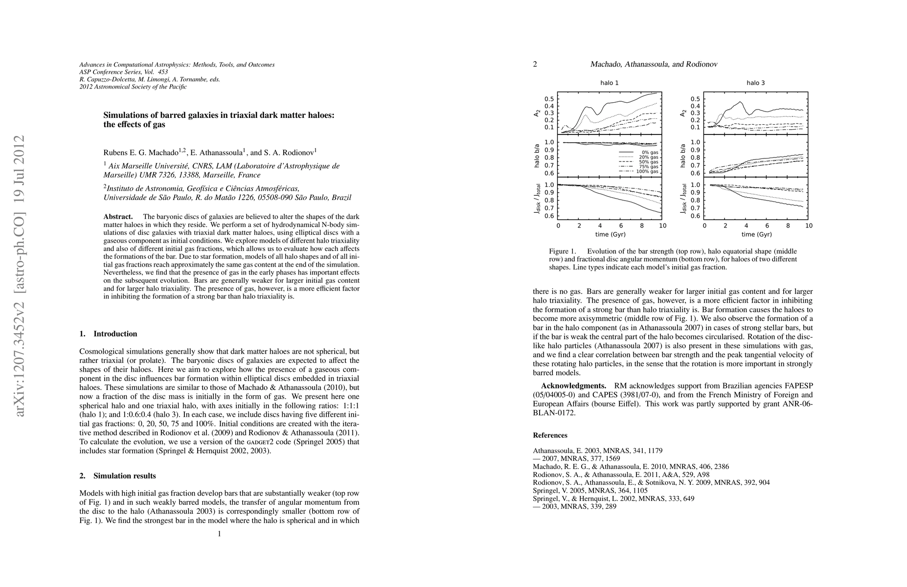 This study uses hydrodynamical N-body simulations to investigate how gas influences the formation of bars in barred galaxies within triaxial dark matter haloes. The simulations show that while gas content eventually stabilizes, its initial presence significantly affects bar strength, with higher initial gas fractions and larger halo triaxiality leading to weaker bars.