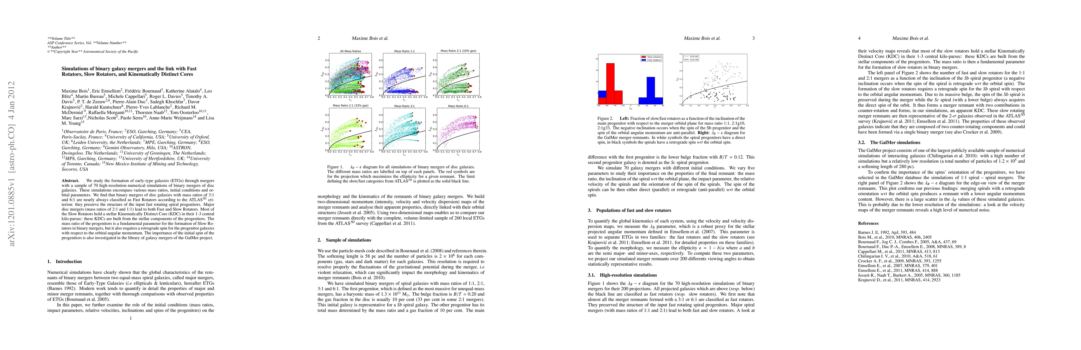 This research investigates the formation of early-type galaxies via binary mergers using high-resolution simulations, revealing that mass ratios significantly influence the resulting galaxy rotation classes. High mass ratio mergers (3:1 and 6:1) typically produce Fast Rotators, while major mergers (2:1 and 1:1) yield both Fast and Slow Rotators, with Slow Rotators often containing Kinematically Distinct Cores formed from progenitor components.