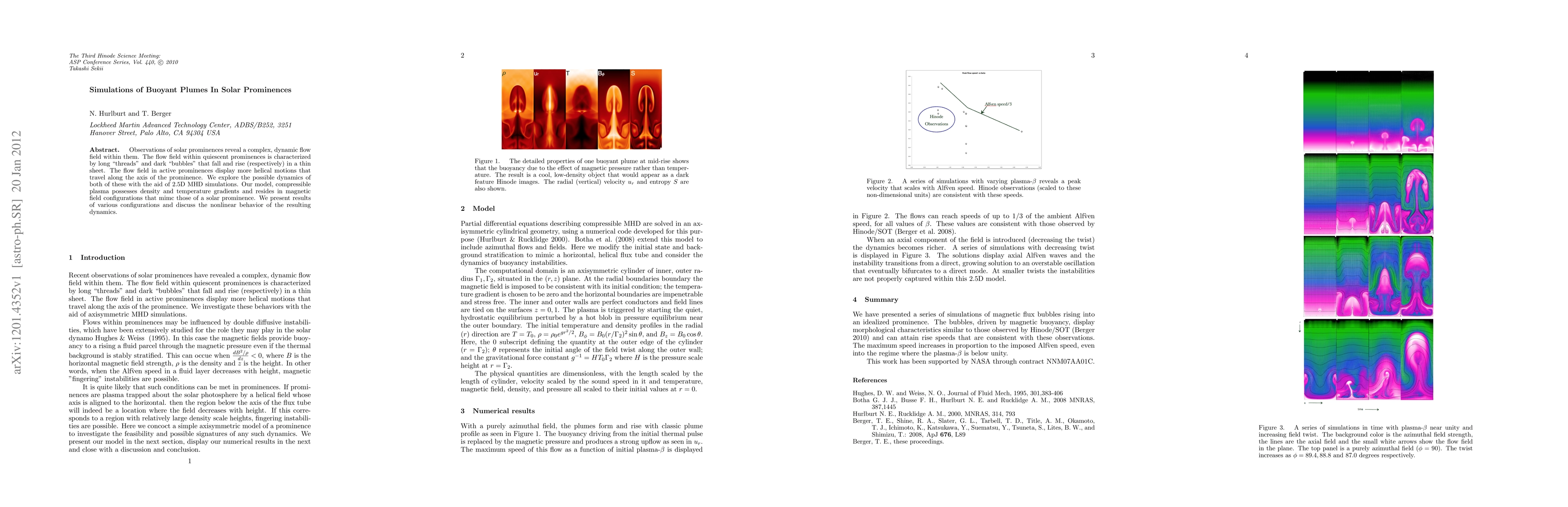 This paper uses 2.5D MHD simulations to explore the dynamics of buoyant plumes in solar prominences, focusing on quiescent and active prominences characterized by different flow patterns. The study reveals nonlinear behaviors in the compressible plasma under magnetic field configurations mimicking those of solar prominences.