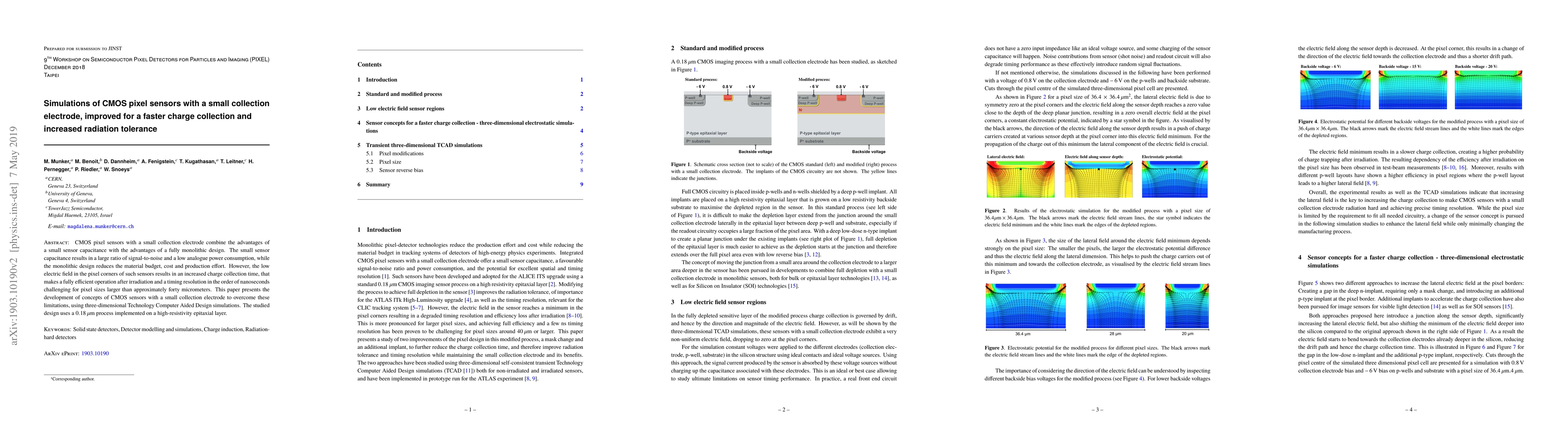 This paper explores CMOS pixel sensors with a small collection electrode designed to enhance charge collection speed and radiation tolerance, using 3D simulations. The proposed design aims to improve signal-to-noise ratio and power efficiency while addressing the challenges of increased charge collection time and radiation damage in larger pixels.