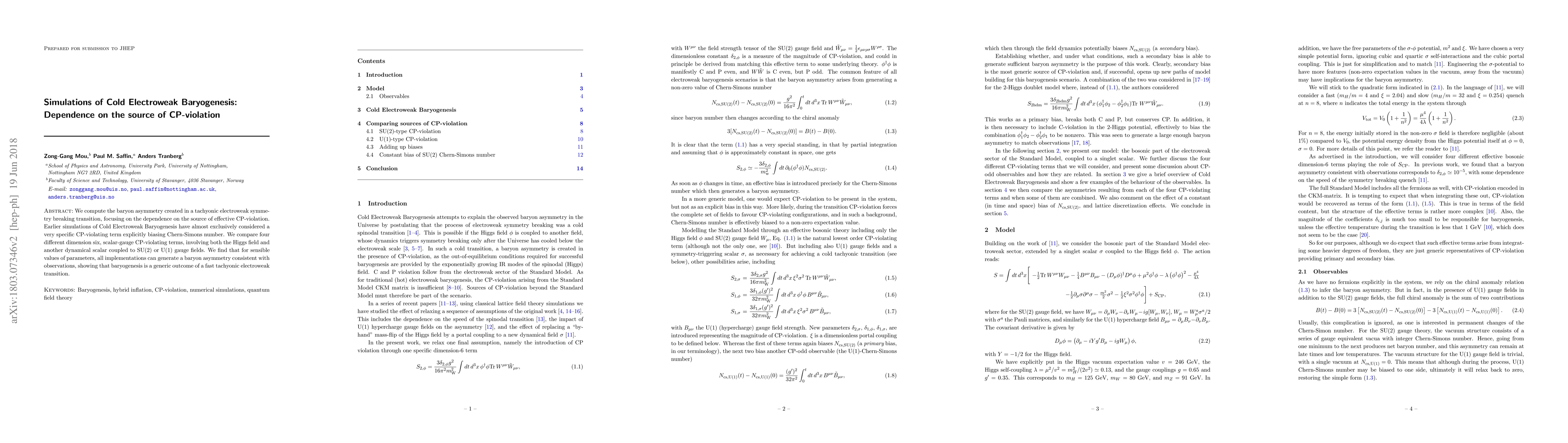 This paper investigates Cold Electroweak Baryogenesis through simulations, focusing on the impact of different CP-violation sources. The study compares four distinct dimension six CP-violating terms, revealing that all can generate a baryon asymmetry consistent with observations, indicating that baryogenesis is a common result of a rapid tachyonic electroweak transition.