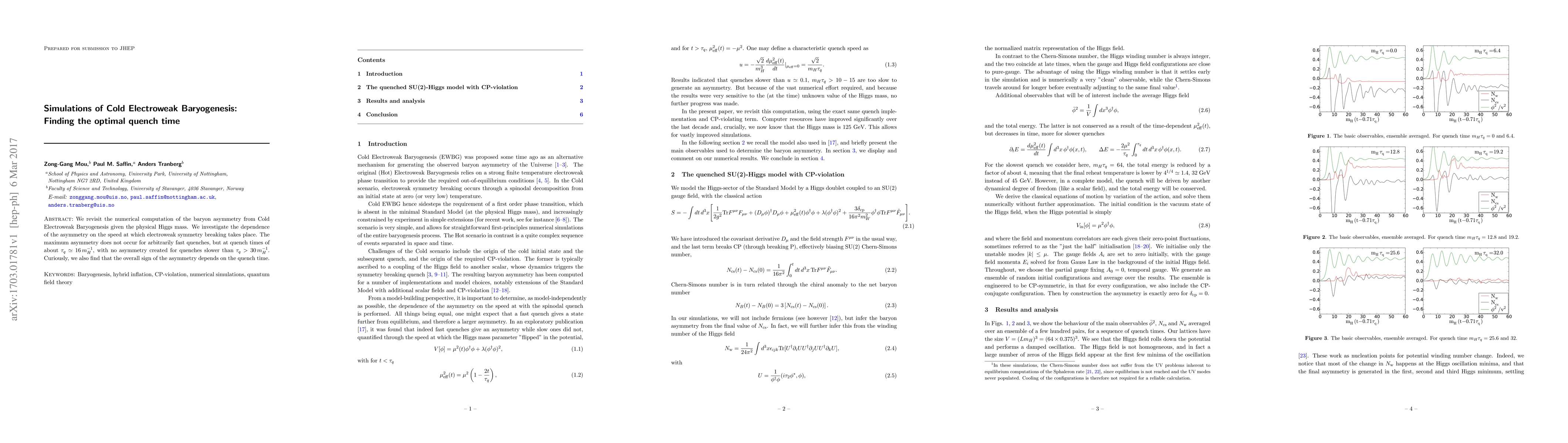 This paper examines the numerical computation of Cold Electroweak Baryogenesis, finding that the optimal baryon asymmetry occurs at a quench time of approximately $\tau_q \simeq 16\, m_H^{-1}$. It also reveals that slower quenches beyond $\tau_q > 30\, m_H^{-1}$ yield no asymmetry, and the sign of the asymmetry is dependent on the quench time.