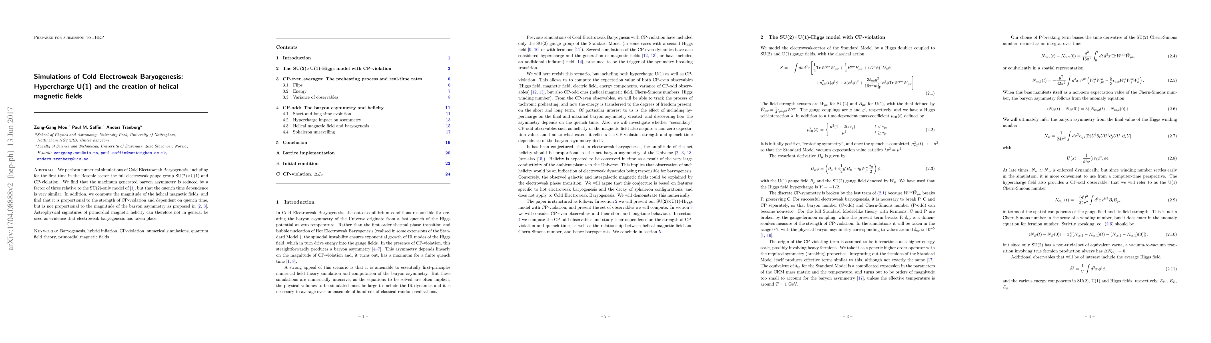 This paper simulates Cold Electroweak Baryogenesis, revealing a threefold reduction in maximum baryon asymmetry compared to the SU(2)-only model, while helical magnetic fields' magnitude correlates with CP-violation strength and quench time, not baryon asymmetry, thus questioning the use of magnetic helicity as evidence for electroweak baryogenesis.