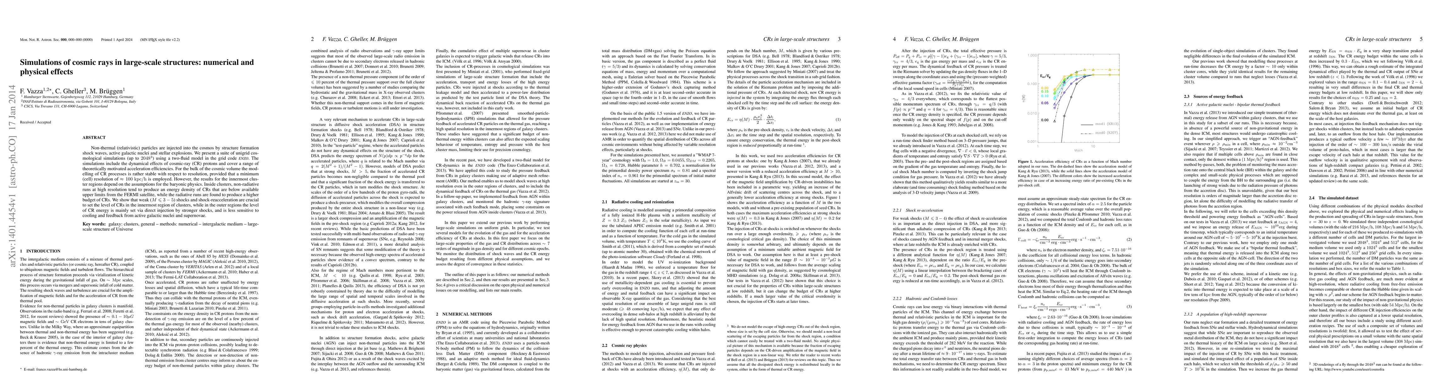 Non-thermal (relativistic) particles are injected into the cosmos by structure formation shock waves, active galactic nuclei and stellar explosions. We present a suite of unigrid cosmological simulations (up to $2048^3$) using a two-fluid model in the grid code ENZO. The simulations include the dynamical effects of cosmic-ray (CR) protons and cover a range of theoretically motivated acceleration efficiencies. For the bulk of the cosmic volume the modelling of CR processes is rather stable with respect to resolution, provided that a minimum (cell) resolution of $\approx 100 ~\rm kpc/h$ is employed. However, the results for the innermost cluster regions depend on the assumptions for the baryonic physics. Inside clusters, non-radiative runs at high resolution tend to produce an energy density of CRs that are below available upper limits from the FERMI satellite, while the radiative runs are found to produce a higher budget of CRs. We show that weak ($M \leq 3-5$) shocks and shock-reacceleration are crucial to set the level of CRs in the innermost region of clusters, while in the outer regions the level of CR energy is mainly set via direct injection by stronger shocks, and is less sensitive to cooling and feedback from active galactic nuclei and supernovae.