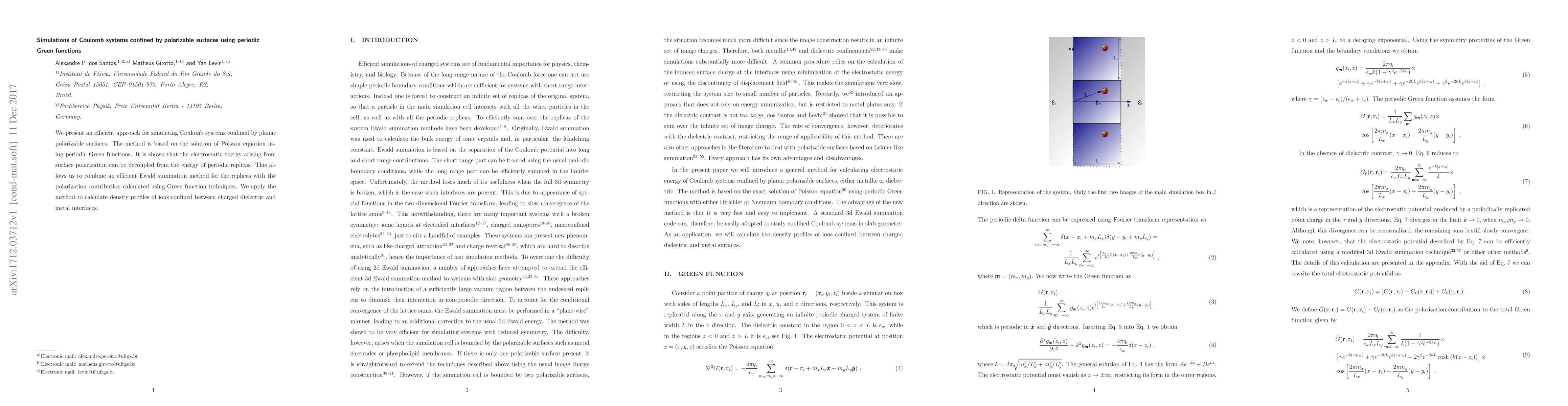 The research presents an efficient approach for simulating Coulomb systems confined by planar polarizable surfaces using periodic Green functions. It decouples the electrostatic energy from surface polarization, allowing for the combination of an efficient Ewald summation method for periodic replicas with Green function techniques for the polarization contribution.