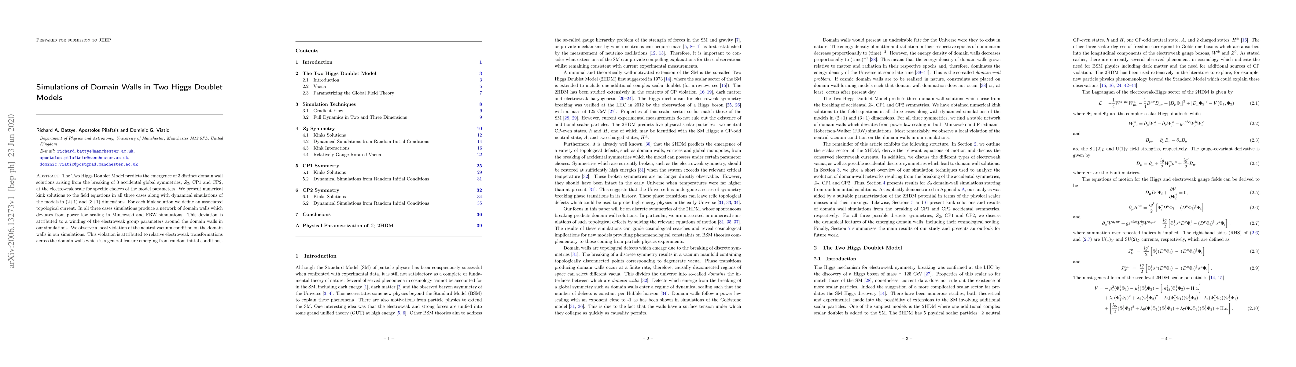 The Two Higgs Doublet Model predicts the emergence of 3 distinct domain wall solutions arising from the breaking of 3 accidental global symmetries, $Z_2$, CP1 and CP2, at the electroweak scale for specific choices of the model parameters. We present numerical kink solutions to the field equations in all three cases along with dynamical simulations of the models in (2+1) and (3+1) dimensions. For each kink solution we define an associated topological current. In all three cases simulations produce a network of domain walls which deviates from power law scaling in Minkowski and FRW simulations. This deviation is attributed to a winding of the electroweak group parameters around the domain walls in our simulations. We observe a local violation of the neutral vacuum condition on the domain walls in our simulations. This violation is attributed to relative electroweak transformations across the domain walls which is a general feature emerging from random initial conditions.