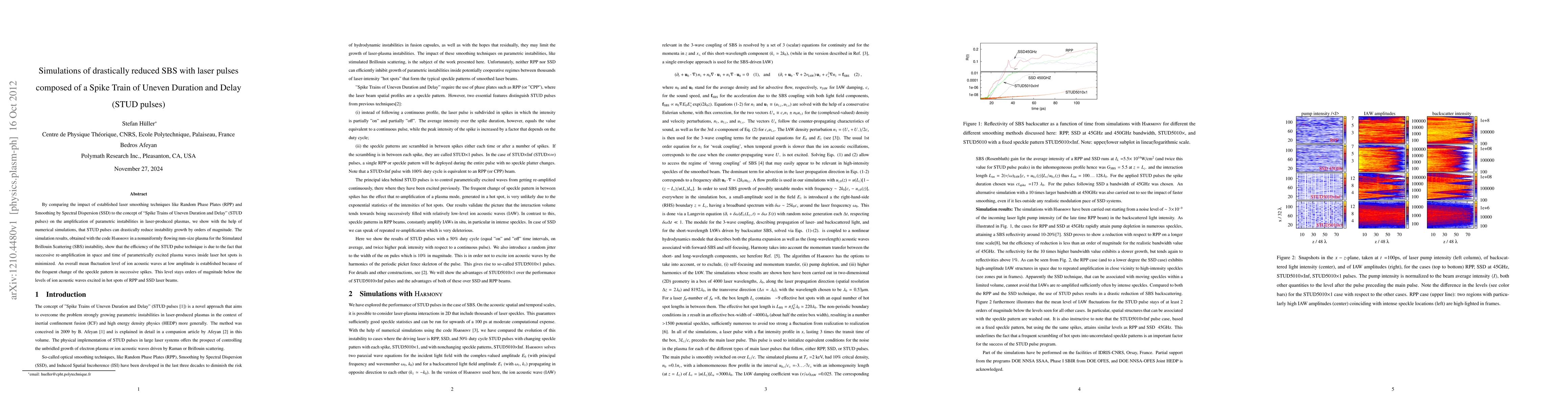 This paper demonstrates that STUD pulses, composed of a Spike Train of Uneven Duration and Delay, drastically reduce Stimulated Brillouin Scattering (SBS) in laser-produced plasmas compared to traditional smoothing techniques. Numerical simulations show that STUD pulses minimize parametric instability growth by minimizing successive re-amplification of plasma waves.
