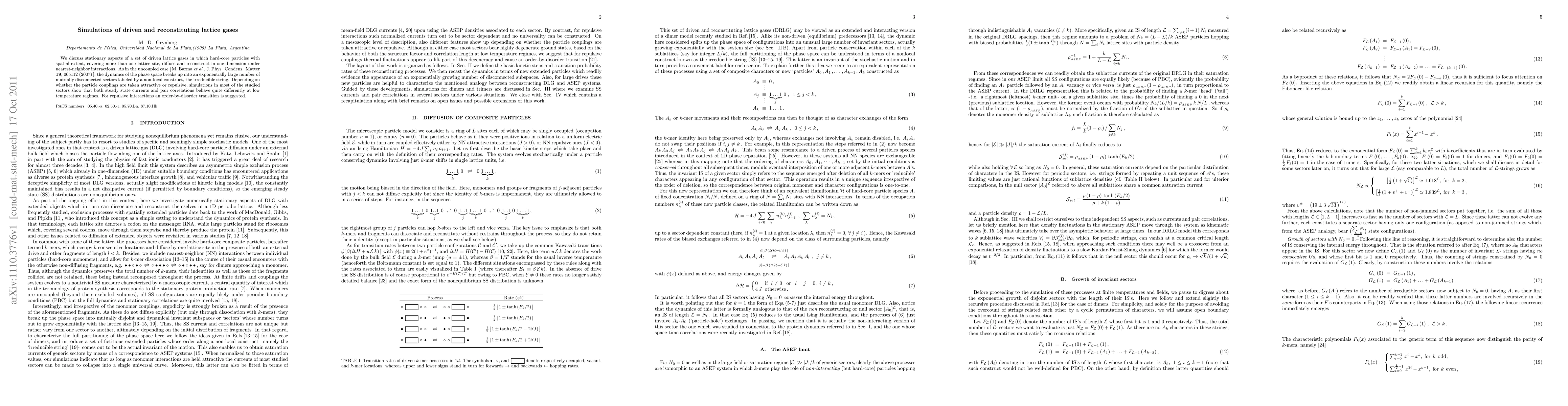 This paper investigates driven lattice gases with hard-core particles that diffuse and reconstruct in one dimension. Simulations reveal distinct steady-state behaviors and pair correlations in low-temperature regimes, suggesting an order-by-disorder transition for repulsive interactions.