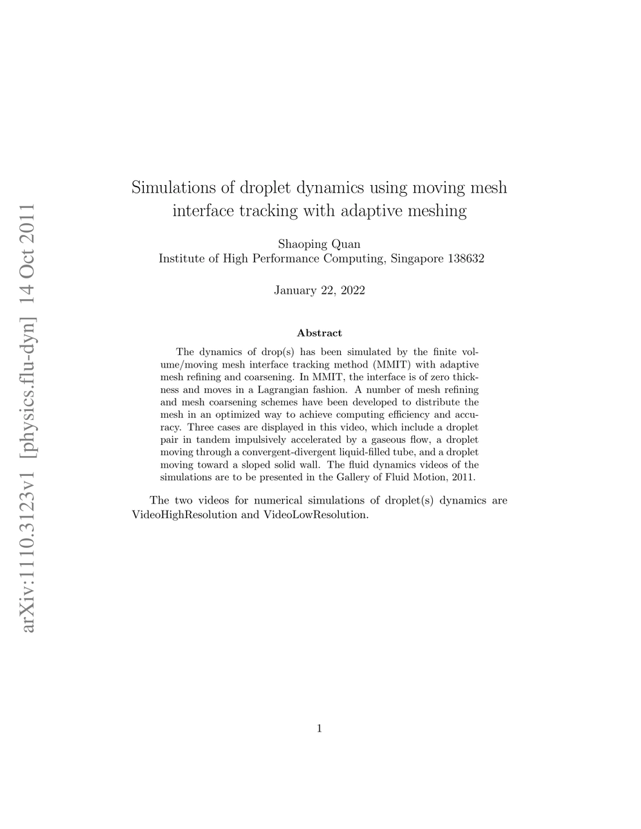 The dynamics of drop(s) has been simulated by the finite volume/moving mesh interface tracking method (MMIT) with adaptive mesh refining and coarsening. In MMIT, the interface is of zero thickness and moves in a Lagrangian fashion. A number of mesh refining and mesh coarsening schemes have been developed to distribute the mesh in an optimized way to achieve computing efficiency and accuracy. Three cases are displayed in this video, which include a droplet pair in tandem impulsively accelerated by a gaseous flow, a droplet moving through a convergent-divergent liquid-filled tube, and a droplet moving toward a sloped solid wall. The fluid dynamics videos of the simulations are to be presented in the Gallery of Fluid Motion, 2011.