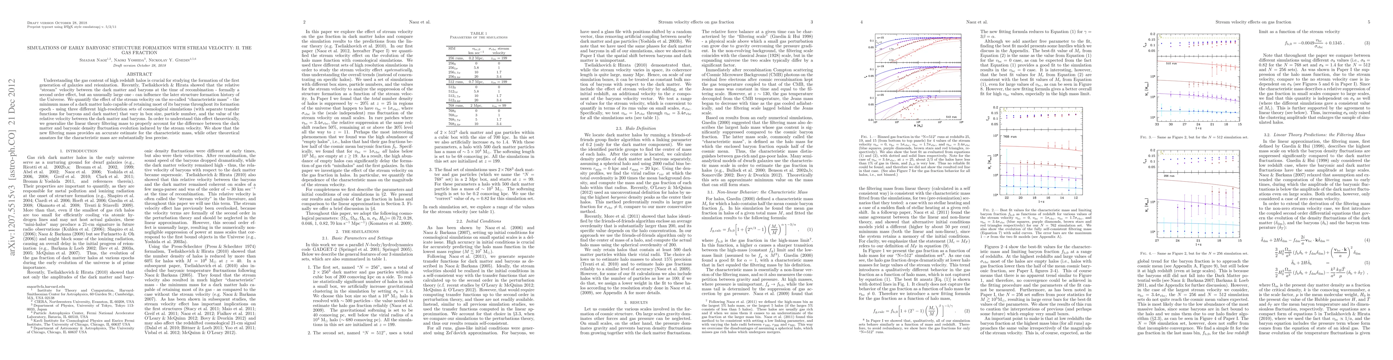 This paper investigates how the relative "stream" velocity between dark matter and baryons at recombination affects the gas content of high redshift halos, crucial for galaxy formation and reionization. The study uses high-resolution cosmological simulations to quantify this effect on the "characteristic mass" of dark matter halos, finding that a new theoretical model accurately estimates this mass compared to other methods.
