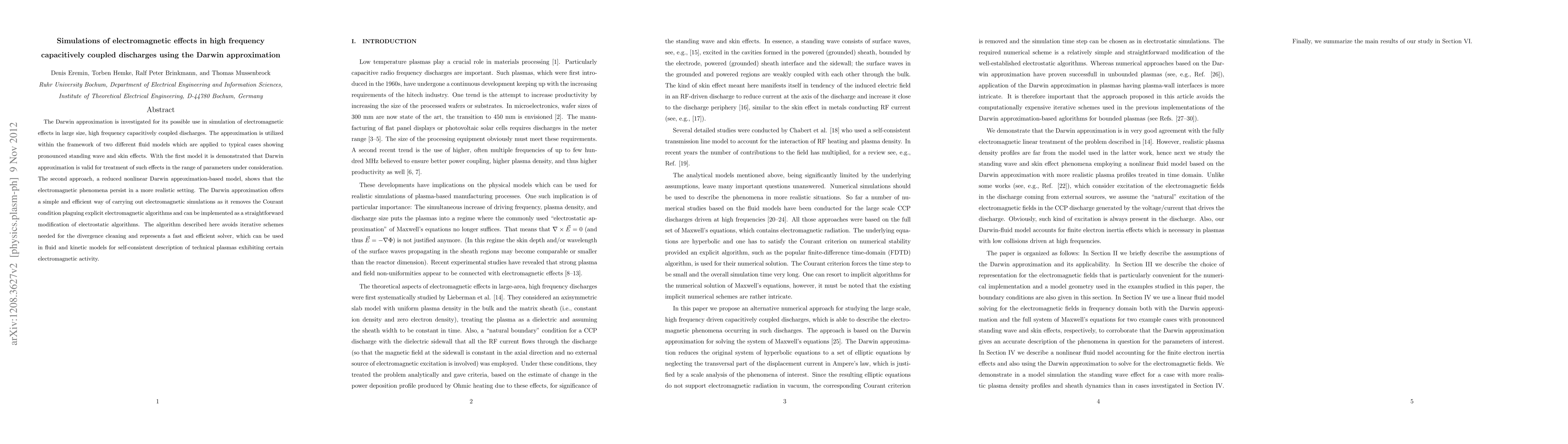 This paper investigates the Darwin approximation for simulating electromagnetic effects in high-frequency capacitively coupled discharges, demonstrating its validity through two fluid models. It shows that the Darwin approximation provides a fast and efficient method for solving electromagnetic simulations, avoiding the Courant condition and simplifying computational complexity.