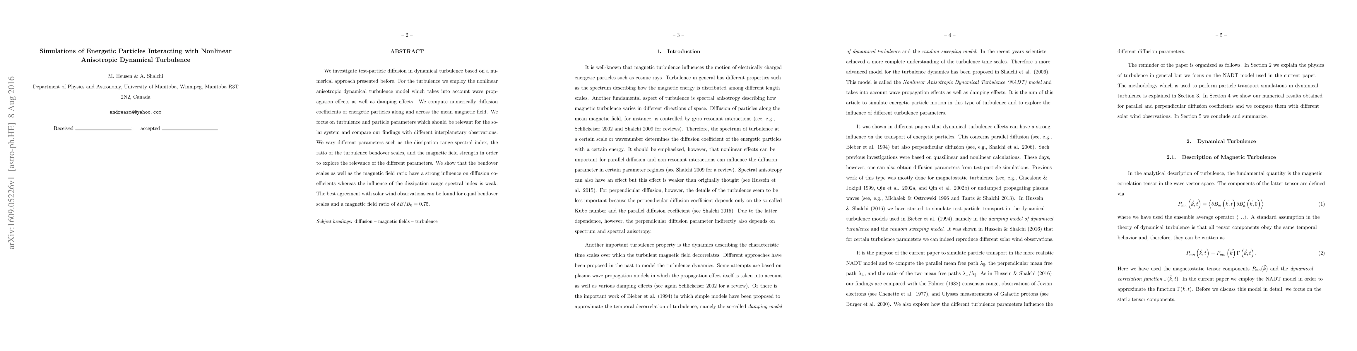 This paper numerically investigates energetic particle diffusion in nonlinear anisotropic dynamical turbulence, finding strong influences from bendover scales and magnetic field ratios on diffusion coefficients. The model aligns best with solar wind observations when bendover scales are equal and the magnetic field ratio is $\delta$B/B0 = 0.75.