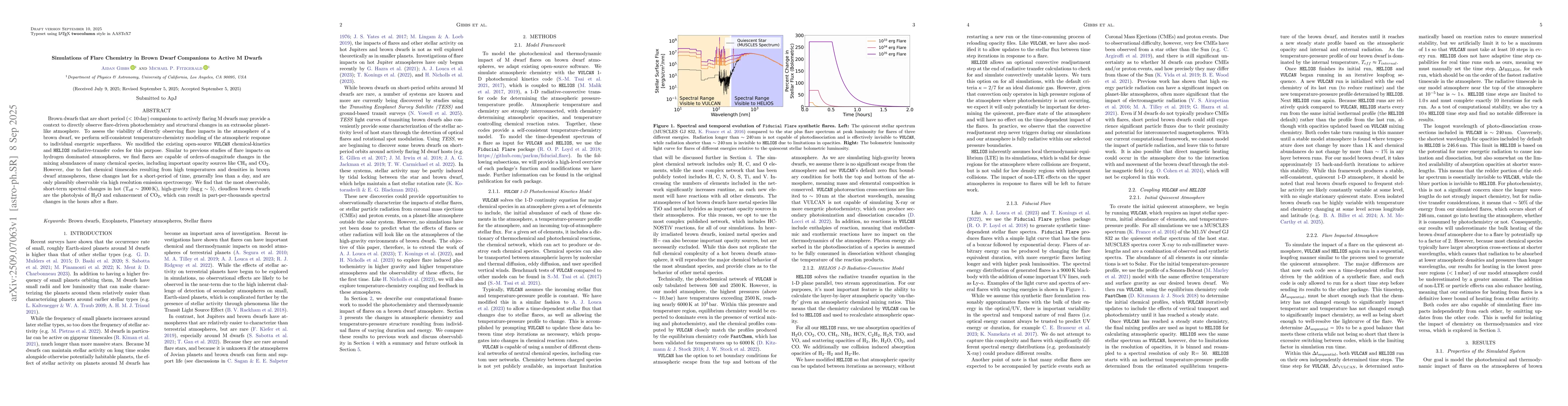 Brown dwarfs that are short period ($<10\,$day) companions to actively flaring M dwarfs may provide a context to directly observe flare-driven photochemistry and structural changes in an extrasolar planet-like atmosphere. To assess the viability of directly observing flare impacts in the atmosphere of a brown dwarf, we perform self-consistent temperature-chemistry modeling of the atmospheric response to individual energetic superflares. We modified the existing open-source \texttt{VULCAN} chemical-kinetics and \texttt{HELIOS} radiative-transfer codes for this purpose. Similar to previous studies of flare impacts on hydrogen dominated atmospheres, we find flares are capable of orders-of-magnitude changes in the mixing abundances of many chemical species, including important opacity sources like CH$_4$ and CO$_2$. However, due to fast chemical timescales resulting from high temperatures and densities in brown dwarf atmospheres, these changes last for a short-period of time, generally less than a day, and are only plausibly observable via high resolution emission spectroscopy. We find that the most observable, short-term spectral changes in hot (T$_{\text{eff}}\sim2000\,$K), high-gravity ($\log{\text{g}}\sim5$), cloudless brown dwarfs are the photolysis of H$_2$O and enhancement of CO$_2$, which can result in part-per-thousands spectral changes in the hours after a flare.