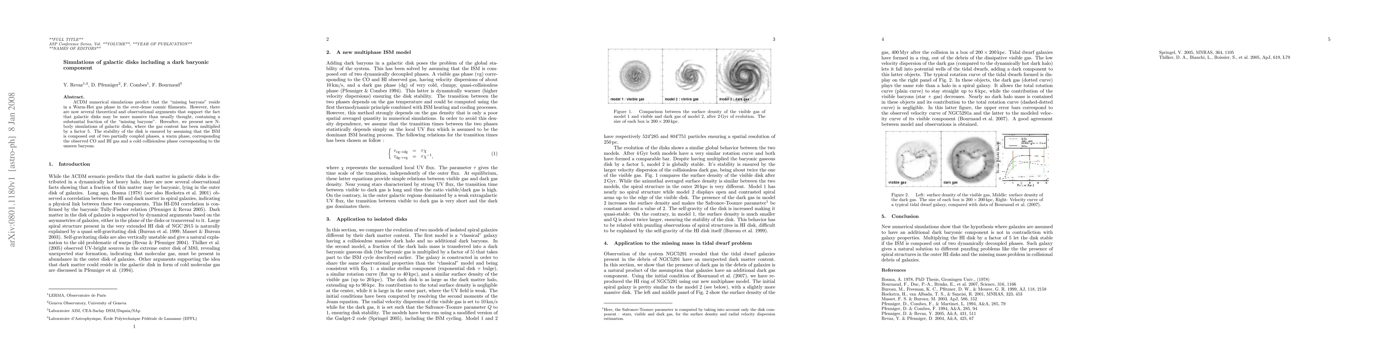 $\Lambda$CDM numerical simulations predict that the "missing baryons" reside in a Warm-Hot gas phase in the over-dense cosmic filaments. However, there are now several theoretical and observational arguments that support the fact that galactic disks may be more massive than usually thought, containing a substantial fraction of the "missing baryons". Hereafter, we present new N-body simulations of galactic disks, where the gas content has been multiplied by a factor 5. The stability of the disk is ensured by assuming that the ISM is composed out of two partially coupled phases, a warm phase, corresponding the observed CO and HI gas and a cold collisionless phase corresponding to the unseen baryons.
