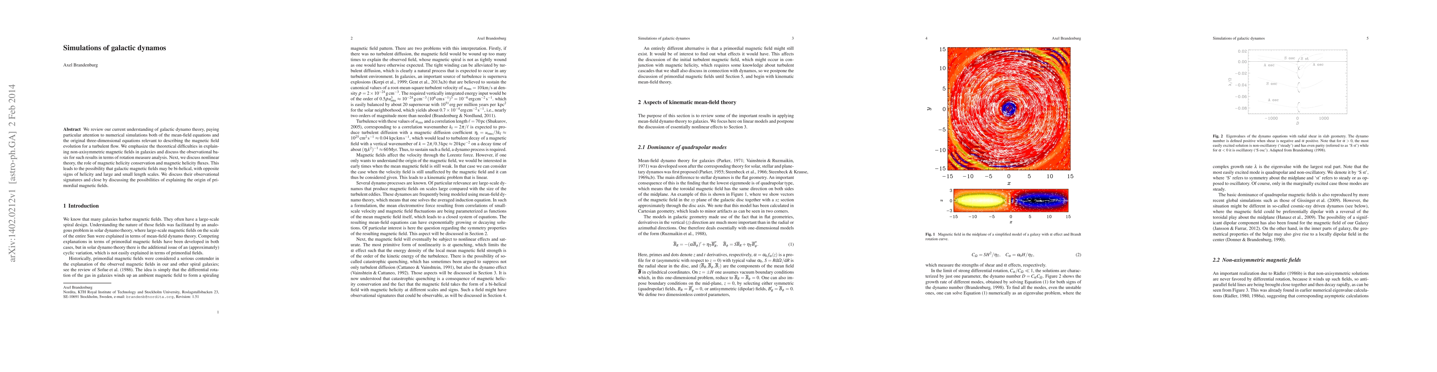We review our current understanding of galactic dynamo theory, paying particular attention to numerical simulations both of the mean-field equations and the original three-dimensional equations relevant to describing the magnetic field evolution for a turbulent flow. We emphasize the theoretical difficulties in explaining non-axisymmetric magnetic fields in galaxies and discuss the observational basis for such results in terms of rotation measure analysis. Next, we discuss nonlinear theory, the role of magnetic helicity conservation and magnetic helicity fluxes. This leads to the possibility that galactic magnetic fields may be bi-helical, with opposite signs of helicity and large and small length scales. We discuss their observational signatures and close by discussing the possibilities of explaining the origin of primordial magnetic fields.