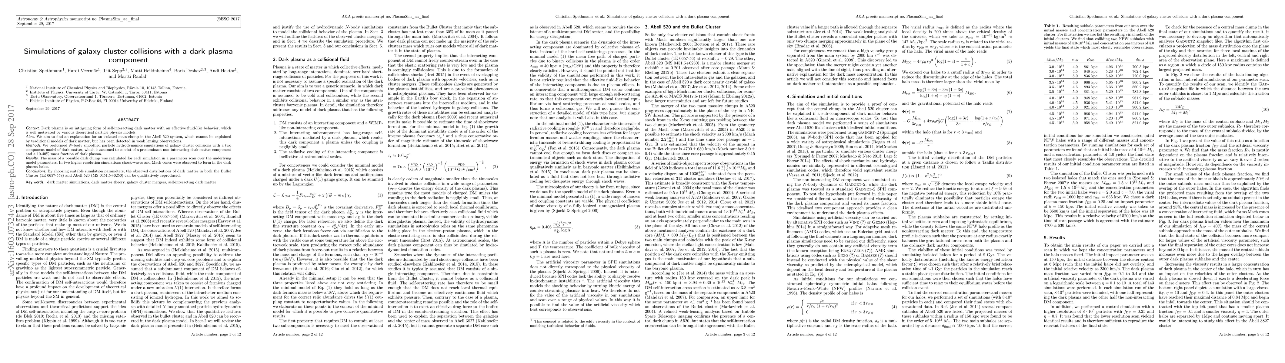 The paper introduces a novel two-component dark matter model incorporating self-interacting dark plasma, demonstrating its potential to explain observed features in galaxy cluster collisions through hydrodynamical simulations.