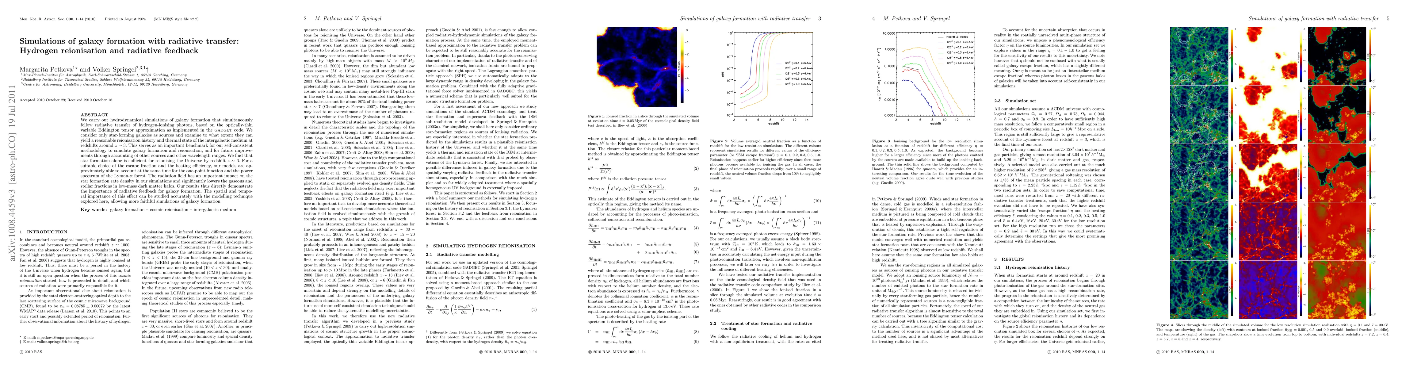 This paper presents hydrodynamical simulations of galaxy formation that incorporate radiative transfer of hydrogen-ionizing photons, showing that star-forming galaxies alone can reionize the Universe by $z\sim6$. The study highlights the significant impact of radiative feedback on star formation rates and the thermal state of the intergalactic medium, emphasizing its importance for accurate galaxy formation simulations.