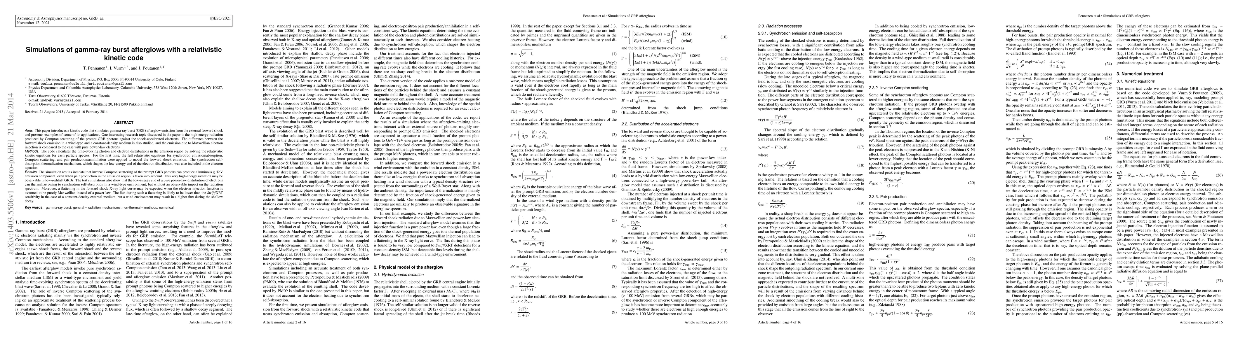 This paper introduces a kinetic code that simulates gamma-ray burst (GRB) afterglow emission from the external forward shock and presents examples of some of its applications. One interesting research topic discussed in the paper is the high-energy radiation produced by Compton scattering of the prompt GRB photons against the shock-accelerated electrons. The difference between the forward shock emission in a wind-type and a constant-density medium is also studied, and the emission due to Maxwellian electron injection is compared to the case with pure power-law electrons. The code calculates the time-evolving photon and electron distributions in the emission region by solving the relativistic kinetic equations for each particle species. For the first time, the full relativistic equations for synchrotron emission/absorption, Compton scattering, and pair production/annihilation were applied to model the forward shock emission. The synchrotron self-absorption thermalization mechanism, which shapes the low-energy end of the electron distribution, was also included in the electron equation. The simulation results indicate that inverse Compton scattering of the prompt GRB photons can produce a luminous TeV emission component, even when pair production in the emission region is taken into account. This very high-energy radiation may be observable in low-redshift GRBs. The test simulations also show that the low-energy end of a pure power-law distribution of electrons can thermalize owing to synchrotron self-absorption in a wind-type environment, but without an observable impact on the radiation spectrum. Moreover, a flattening in the forward shock X-ray light curve may be expected when the electron injection function is assumed to be purely Maxwellian instead of a power law.