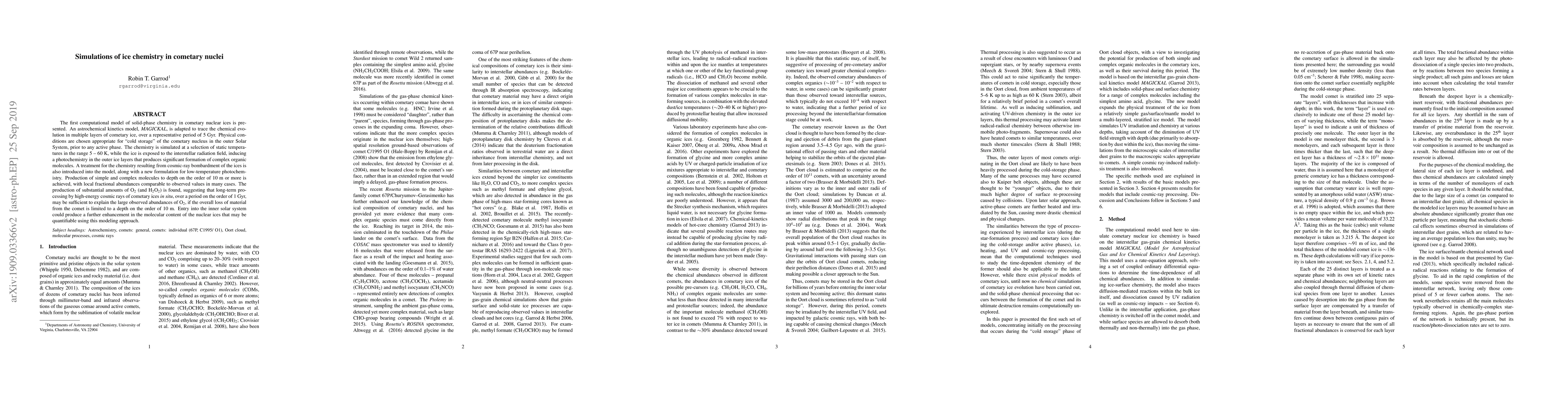 Researchers simulate ice chemistry in cometary nuclei over 5 Gyr, producing significant amounts of complex organic molecules and oxygen, suggesting long-term processing can explain large comet abundances.