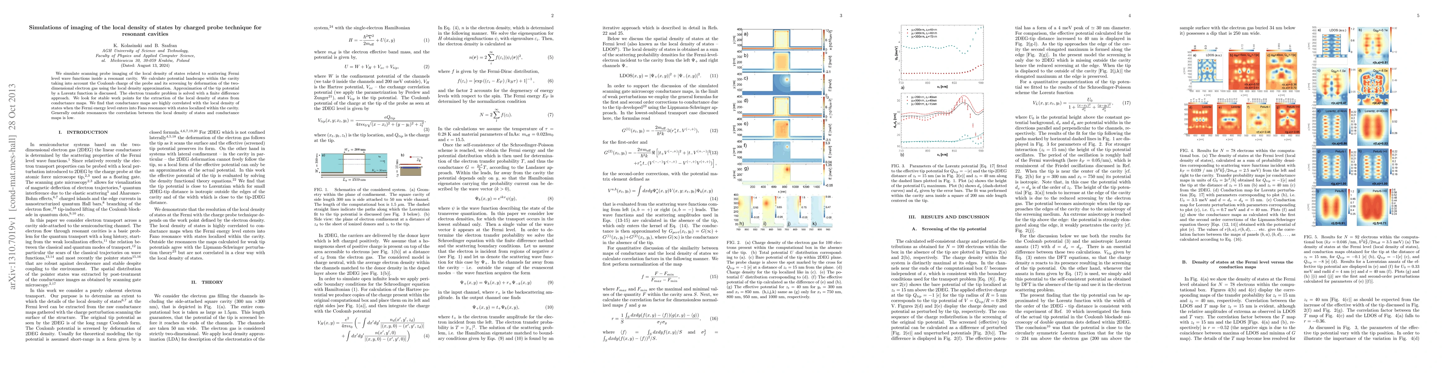 We simulate scanning probe imaging of the local density of states related to scattering Fermi level wave functions inside a resonant cavity. We calculate potential landscape within the cavity taking into account the Coulomb charge of the probe and its screening by deformation of the two-dimensional electron gas using the local density approximation. Approximation of the tip potential by a Lorentz function is discussed. The electron transfer problem is solved with a finite difference approach. We look for stable work points for the extraction of the local density of states from conductance maps. We find that conductance maps are highly correlated with the local density of states when the Fermi energy level enters into Fano resonance with states localized within the cavity. Generally outside resonances the correlation between the local density of states and conductance maps is low.