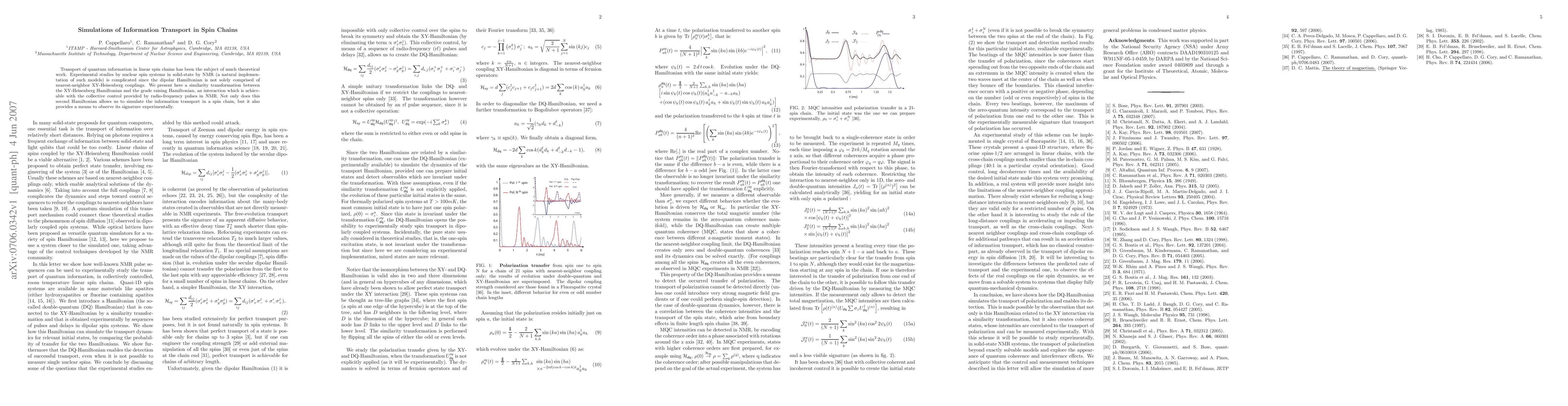 Transport of quantum information in linear spin chains has been the subject of much theoretical work. Experimental studies by nuclear spin systems in solid-state by NMR (a natural implementation of such models) is complicated since the dipolar Hamiltonian is not solely comprised of nearest-neighbor XY-Heisenberg couplings. We present here a similarity transformation between the XY-Heisenberg Hamiltonian and the grade raising Hamiltonian, an interaction which is achievable with the collective control provided by radio-frequency pulses in NMR. Not only does this second Hamiltonian allows us to simulate the information transport in a spin chain, but it also provides a means to observe its signature experimentally.