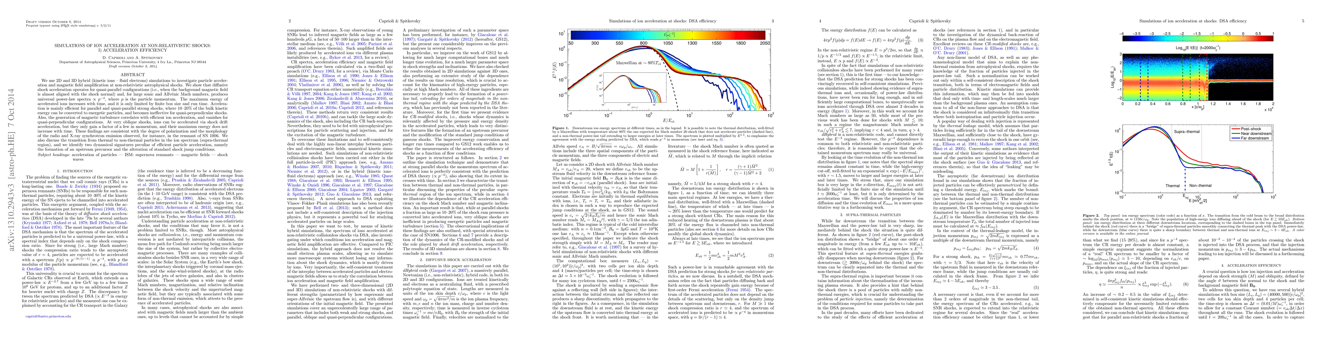 We use 2D and 3D hybrid (kinetic ions - fluid electrons) simulations to investigate particle acceleration and magnetic field amplification at non-relativistic astrophysical shocks. We show that diffusive shock acceleration operates for quasi-parallel configurations (i.e., when the background magnetic field is almost aligned with the shock normal) and, for large sonic and Alfv\'enic Mach numbers, produces universal power-law spectra proportional to p^(-4), where p is the particle momentum. The maximum energy of accelerated ions increases with time, and it is only limited by finite box size and run time. Acceleration is mainly efficient for parallel and quasi-parallel strong shocks, where 10-20% of the bulk kinetic energy can be converted to energetic particles, and becomes ineffective for quasi-perpendicular shocks. Also, the generation of magnetic turbulence correlates with efficient ion acceleration, and vanishes for quasi-perpendicular configurations. At very oblique shocks, ions can be accelerated via shock drift acceleration, but they only gain a factor of a few in momentum, and their maximum energy does not increase with time. These findings are consistent with the degree of polarization and the morphology of the radio and X-ray synchrotron emission observed, for instance, in the remnant of SN 1006. We also discuss the transition from thermal to non-thermal particles in the ion spectrum (supra-thermal region), and we identify two dynamical signatures peculiar of efficient particle acceleration, namely the formation of an upstream precursor and the alteration of standard shock jump conditions.