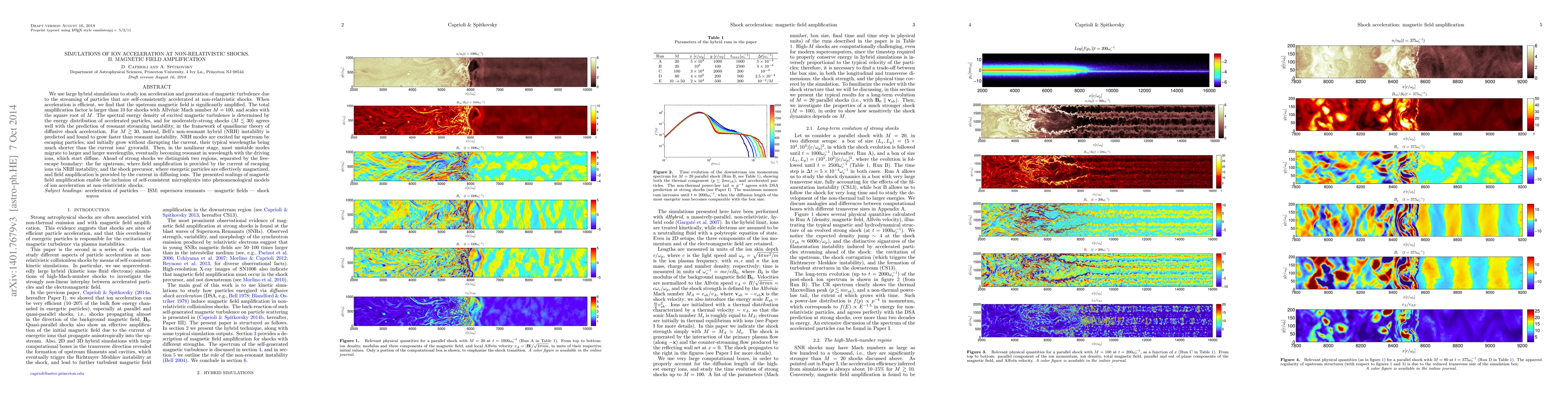 This paper uses hybrid simulations to explore ion acceleration and magnetic field amplification at non-relativistic shocks, finding significant amplification for Alfv\'enic Mach numbers $M=100$. The study reveals that magnetic turbulence is driven by the energy distribution of accelerated particles, with different instabilities dominating for different shock strengths.