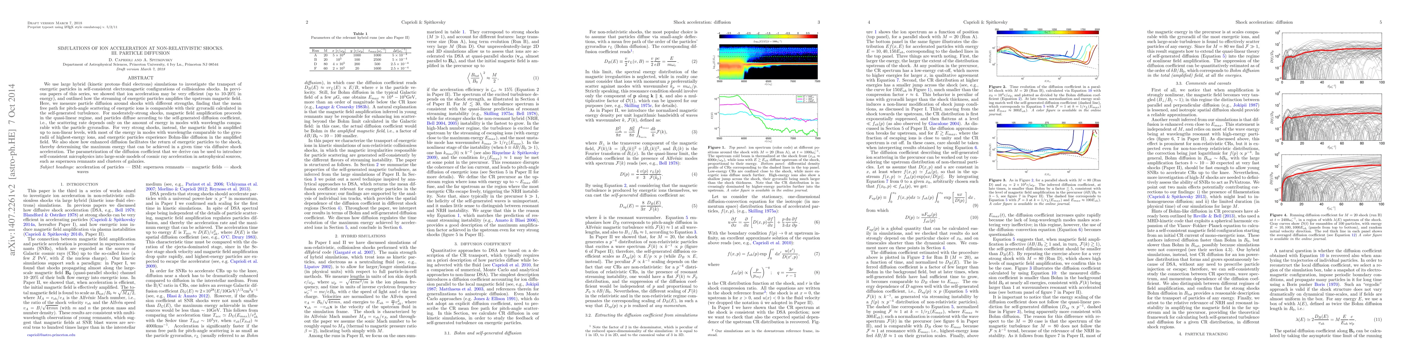 This paper uses hybrid simulations to study energetic particle transport at non-relativistic shocks, finding that particle diffusion is comparable to gyroradii in self-generated turbulence. For strong shocks, particles experience Bohm-like diffusion, which influences the maximum achievable energy via diffusive shock acceleration.