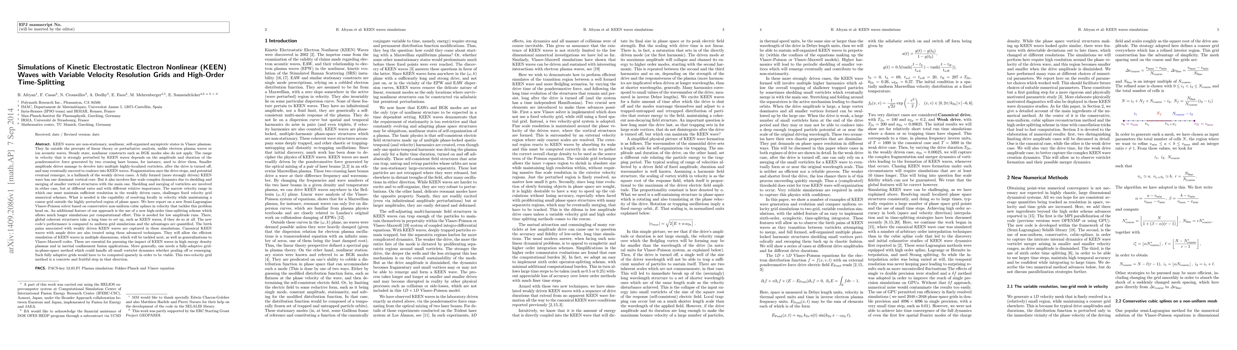 KEEN waves are nonlinear, non-stationary, self-organized asymptotic states in Vlasov plasmas outside the scope or purview of linear theory constructs such as electron plasma waves or ion acoustic waves. Nonlinear stationary mode theories such as those leading to BGK modes also do not apply. The range in velocity that is strongly perturbed by KEEN waves depends on the amplitude and duration of the ponderomotive force used to drive them. Smaller amplitude drives create highly localized structures attempting to coalesce into KEEN waves. These cases have much more chaotic and intricate time histories than strongly driven ones. The narrow range in which one must maintain adequate velocity resolution in the weakly driven cases challenges xed grid numerical schemes. What is missing there is the capability of resolving locally in velocity while maintaining a coarse grid outside the highly perturbed region of phase space. We here report on a new Semi-Lagrangian Vlasov-Poisson solver based on conservative non-uniform cubic splines in velocity that tackles this problem head on. An additional feature of our approach is the use of a new high-order time-splitting scheme which allows much longer simulations per computational e ort. This is needed for low amplitude runs which take a long time to set up KEEN waves, if they are able to do so at all. The new code's performance is compared to uniform grid simulations and the advantages quanti ed. The birth pains associated with KEEN waves which are weakly driven is captured in these simulations. These techniques allow the e cient simulation of KEEN waves in multiple dimensions which will be tackled next as well as generalizations to Vlasov-Maxwell codes which are essential to understanding the impact of KEEN waves in practice.